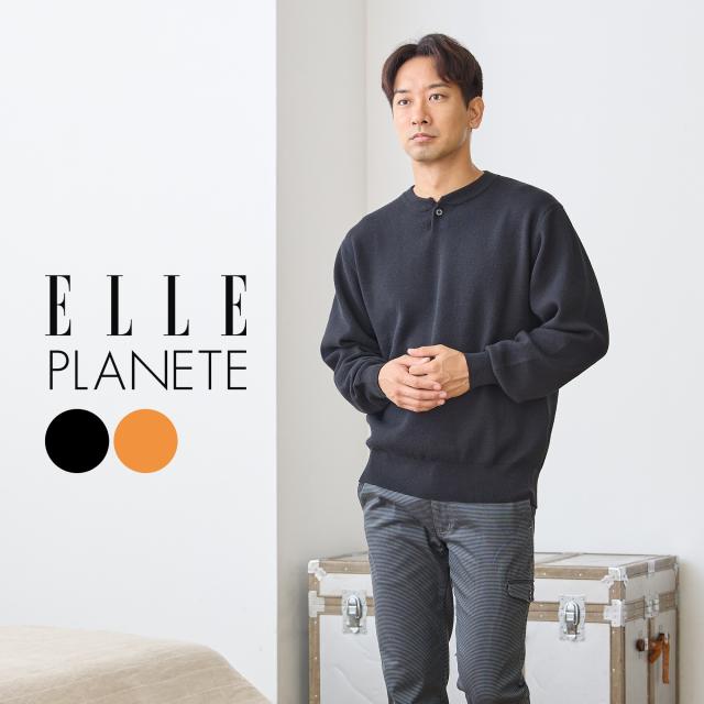 ニット メンズ 長袖 セーター ヘンリーネック ブランド ELLE PLANETE エルプラネット カジュアル 上品 シンプル 無地 大人カジュアル ハイゲージ ポリエステル ソフトタッチ もちもち触感 袖リブ 裾リブ 30代 40代 50代 秋 冬 オレンジ 黒 プレゼント