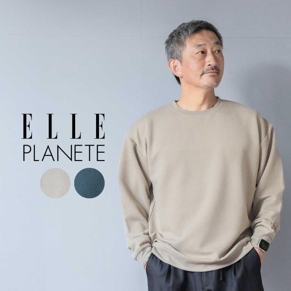 トレーナー メンズ 薄手 スウェット 長袖 ELLEPLANETE エルプラネット ブランド クルーネック ジャガード 切り替え シンプル 刺繍 無地 上品 ゆったり ロンT トップス カジュアル ベージュ グリーン 裾リブ 袖リブ 30代 40代 50代 60代 秋 冬 春