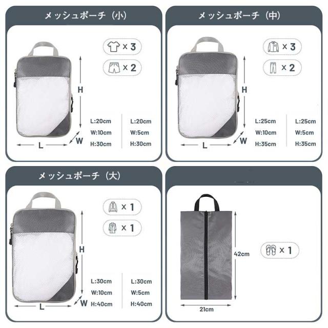 | サイズについての説明 | セット内容: (1)メッシュポーチ(大) (2)メッシュポーチ(中) (3)メッシュポーチ(小) (4)シューズバッグ サイズ: (1)メッシュポーチ(大):約40*30*10cm/40*30*5cm(圧縮後) (2)メッシュポーチ(中):約35*25*10cm/35*25*5cm(圧縮後) (3)メッシュポーチ(小):約30*20*10cm/30*20*5cm(圧縮後) (4)シューズバッグ:21*42cm ※上記サイズは平置き実寸になります。 サイズ表の実寸法は商品によって1-2cm程度の誤差がある場合がございます。 |