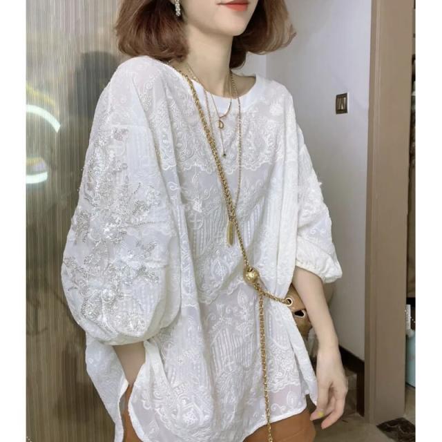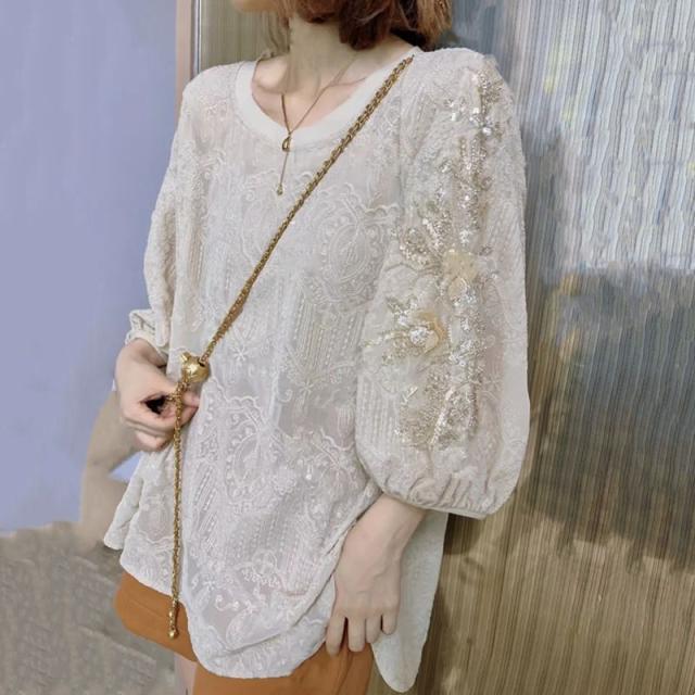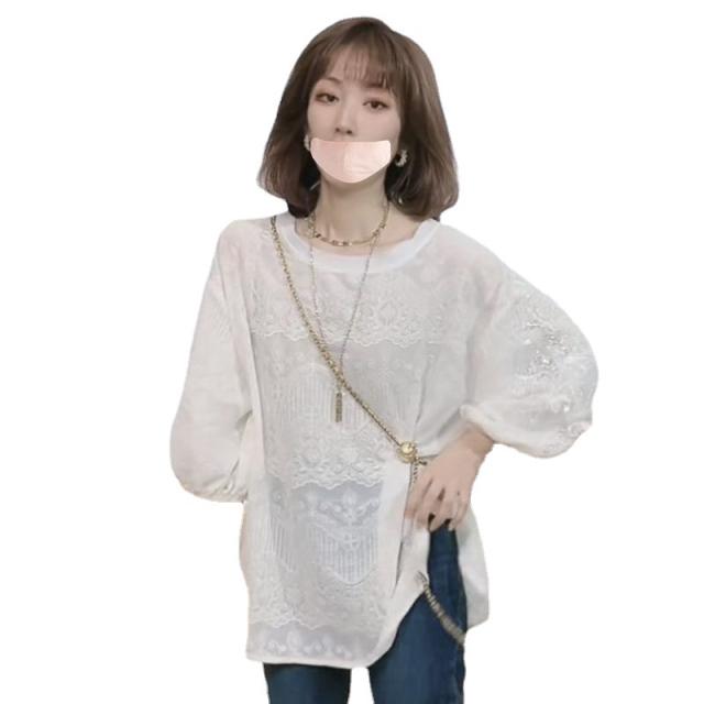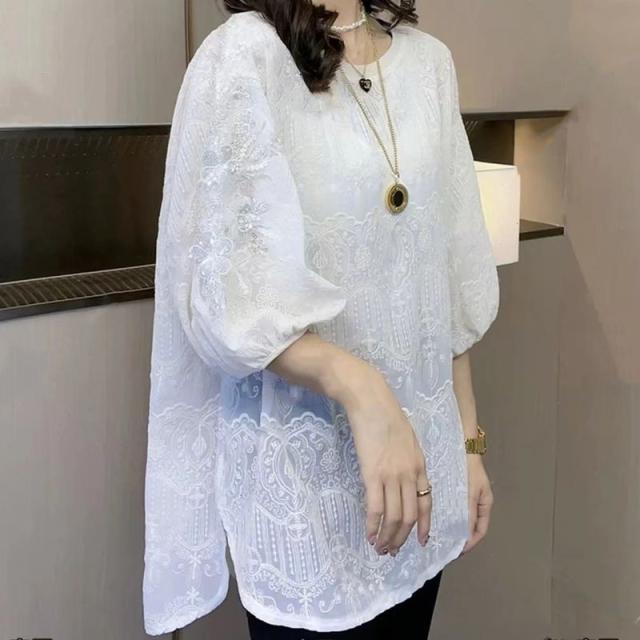 ブラウス レディース シャツ レース 刺繍 プルオーバー 冷房対策 ゆったり 体型カバー 抜け感 可愛い おしゃれ カジュアル 普段着 夏物 無地