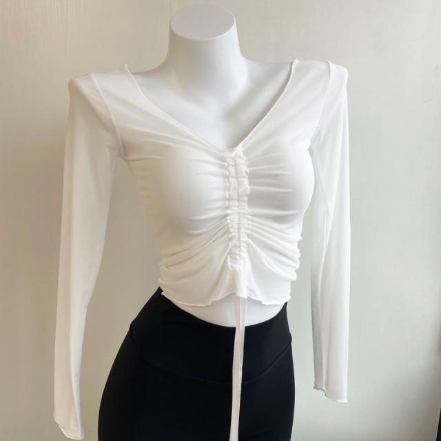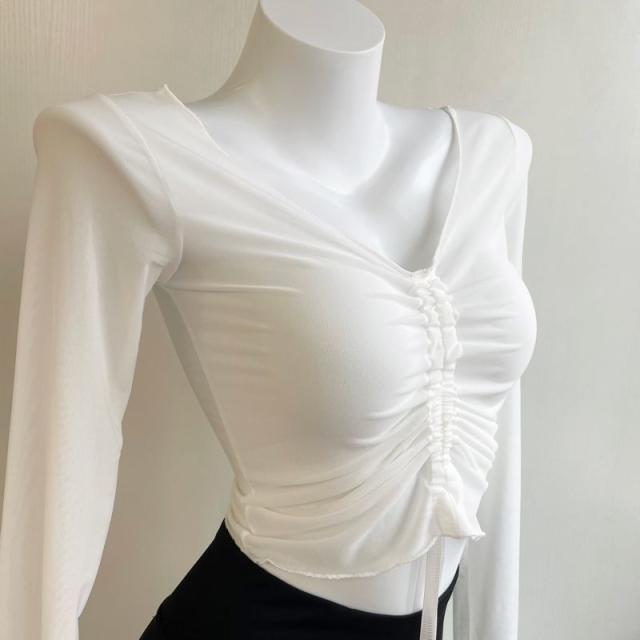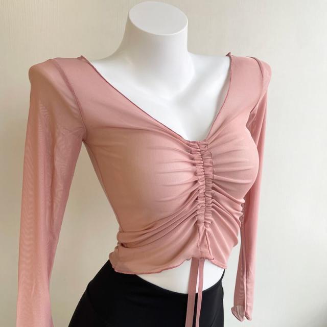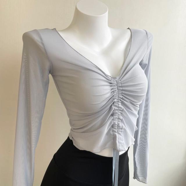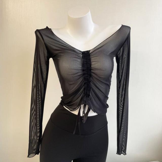シアー tシャツ トップス 長袖 バレエ トップス シースルー ギャザー ショート丈 透け感あり チュール メッシュ レッスン着 ダンス 練習着 大人 ダンス衣装 社交ダンス