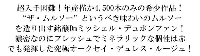 ミッシェル・デュポン・ファンのムルソーは収穫を極限まで遅らせた超完熟ブドウから造られます。その味わいは、蜂蜜を連想させる旨味溢れる果実味がギュっと詰まった魅惑的なもの。通常のムルソーの枠に収まりきらないような個性のある素晴らしい逸品です。 | ![]() ■ぶどう品種:ピノ・ノワール ■発酵・熟成:オーク樽11ヶ月熟成 ■樹齢:50年 ■土壌:粘土石灰質土壌 ■栽培:ヴィエイユ・ヴィーニュの厳選栽培 高級オークセイ・デュレス愛好家大注目!大人気高級辛口ブルゴーニュ赤ワイン愛好家大注目!“ザ・ムルソー”というべき味わいのムルソーを造り出す銘醸ドメーヌとして有名なミッシェル・デュポンファンが造る傑作ピノ・ノワール! 濃密なのにフレッシュでミネラリックな個性は赤でも発揮!年産僅か4,500本のみ! ドメーヌ・ミッシェル・デュポンファンの究極オークセイ・デュレス赤は、粘土石灰質土壌の樹齢50年ヴィエイユ・ヴィーニュの厳選ピノ・ノワール100%をオーク樽11ヶ月熟成させた究極辛口赤ワイン。 凝縮した黒果実系の豊かなアロマと濃密なフランボワーズのような果実感、固さを感じるミネラル感、そして力強いタンニンが特徴です。高級オークセイ・デュレス・ルージュは、限定極少量入荷の正規代理店輸入品として2021年に登場。 |