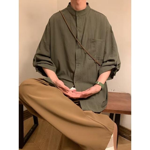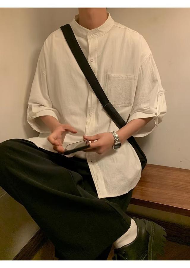 シャツ バンドカラー メンズ 半袖シャツ ノーアイロン加工 胸ポケット 七分袖 7分袖 長袖 襟なしシャツ バンドカラーシャツ 白シャツ