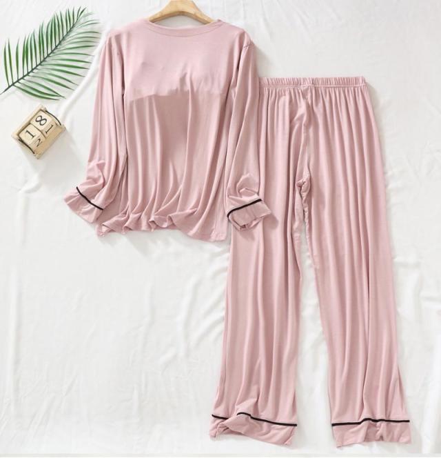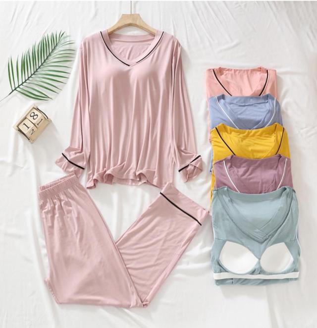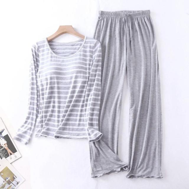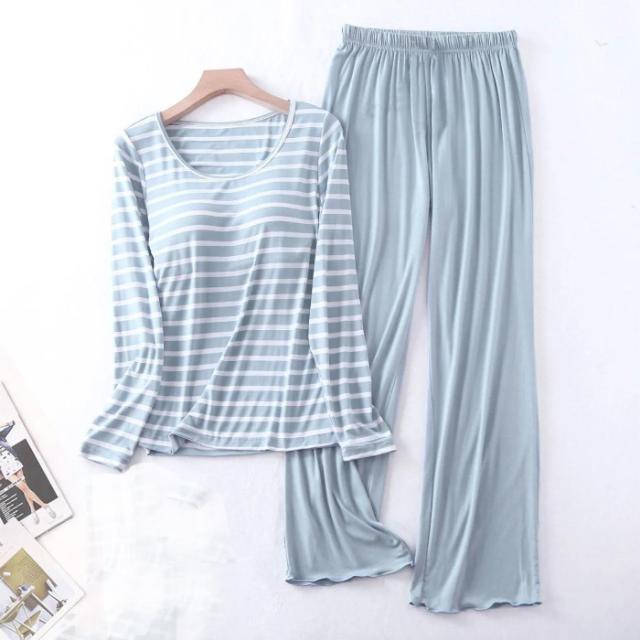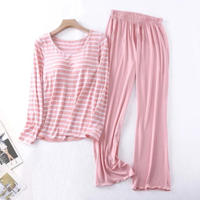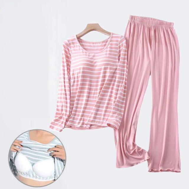 2点セット カップ付き ルームウエア ボーダー 上下セット 長袖 Tシャツ ロングパンツ レディース パジャマ 春 夏 秋 冬 着心地いい