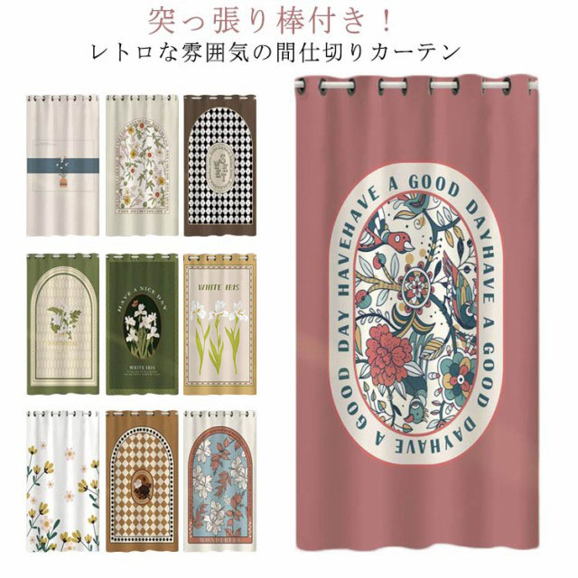 | 突っ張り棒付き!レトロな雰囲気の間仕切りカーテン 取り付けも簡単!つっぱりポールやのれん棒を通すだけ! お部屋、キッチンの出入り口に、洗面スペースの間仕切りはもちろん、やデッドスペースを生かして洋服の収納などにもオススメです。 省エネ対策にもなり、ちょっとした間仕切りや目隠しなど様々な場所で大活躍! | |