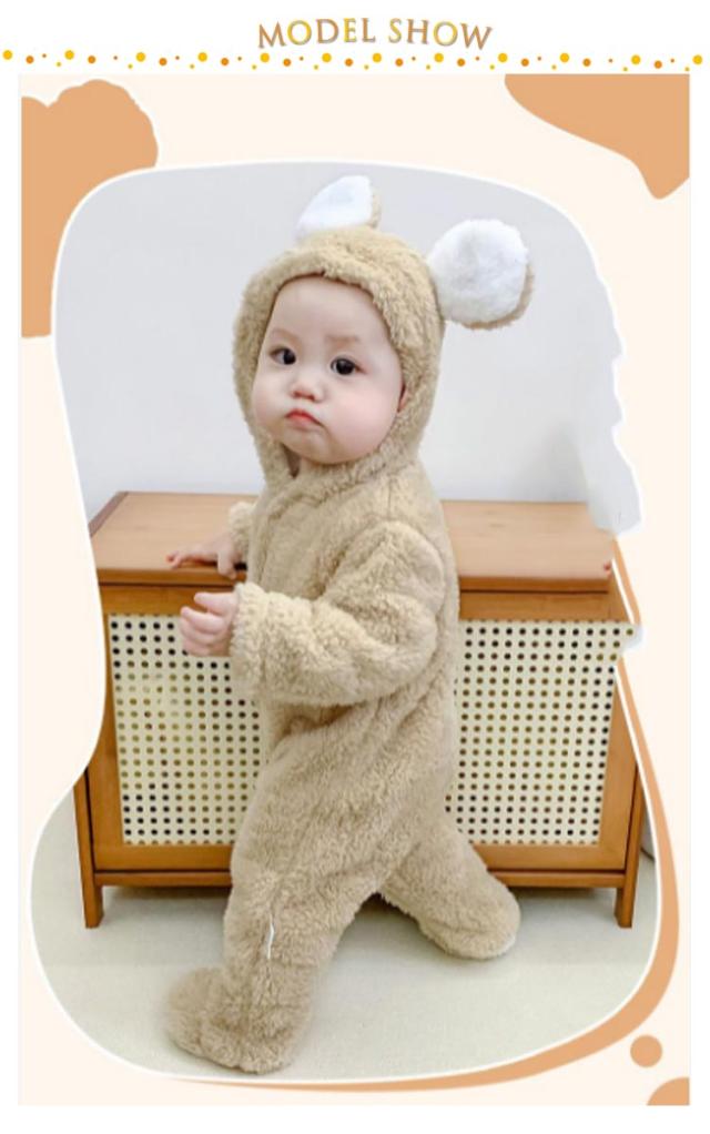 | ベビーちゃんがカワイイクマさんに大変身! 柔らかくソフトな肌触りが特徴的なスムースなの で とっても着心地がよい。 赤ちゃんの頭からつま先まですっぽりと包んでベビーロンパースです。 スナップボタンの前開きで足まで開くので、着脱は簡単、お着替えやオムツ交換も楽チン♪ | |