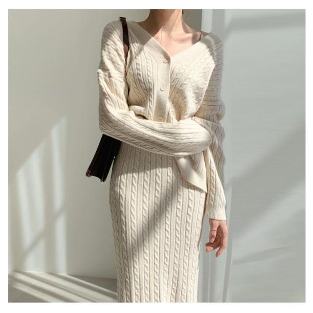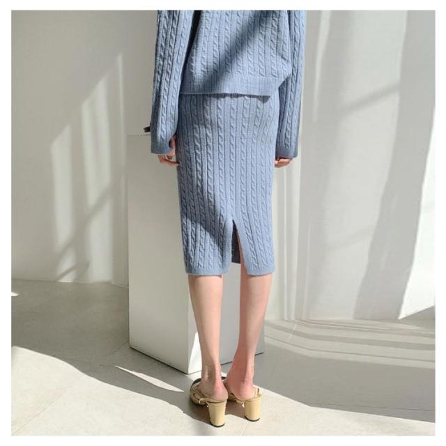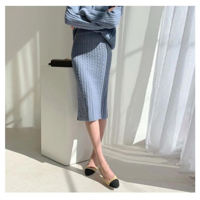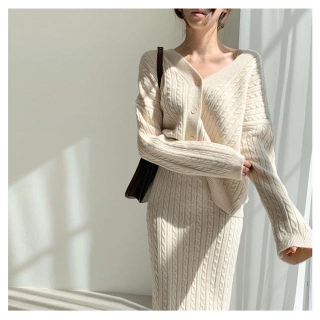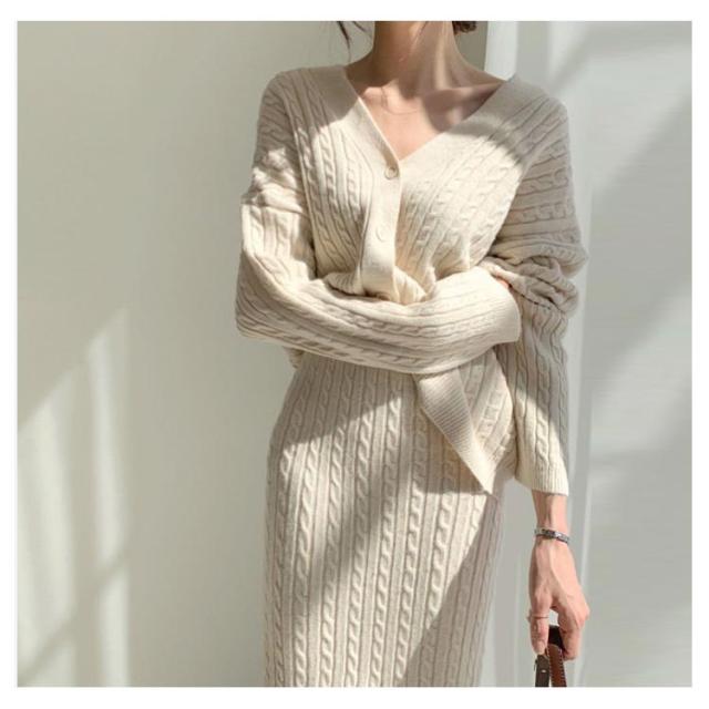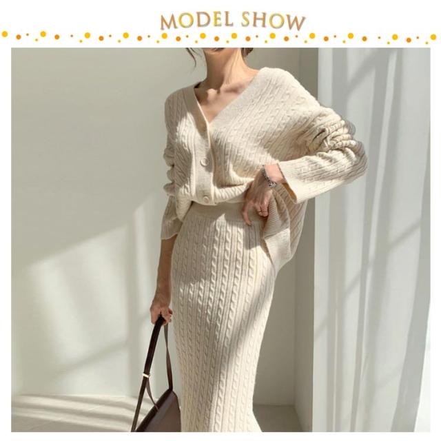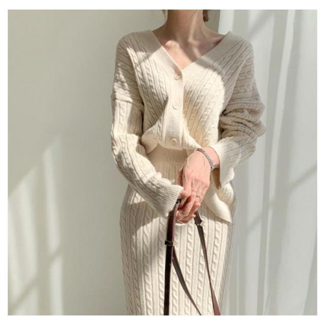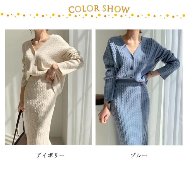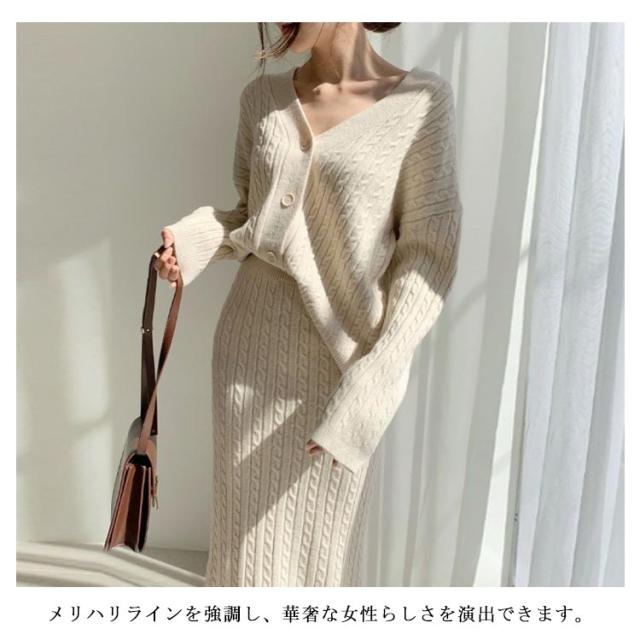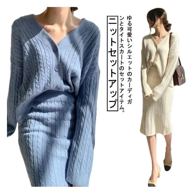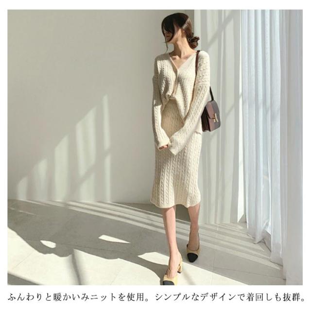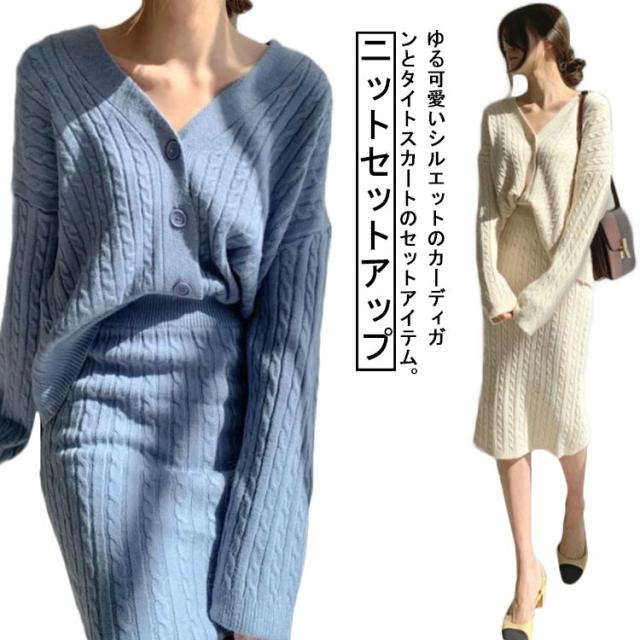 ニットアップ ニット セットアップ レディース スカート トップス 2点セット 長袖 vネック ケーブル編み セーター タイトスカート ミモレ丈 オフィス 無地 白 ホワイト 秋冬