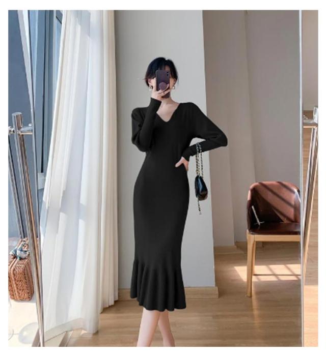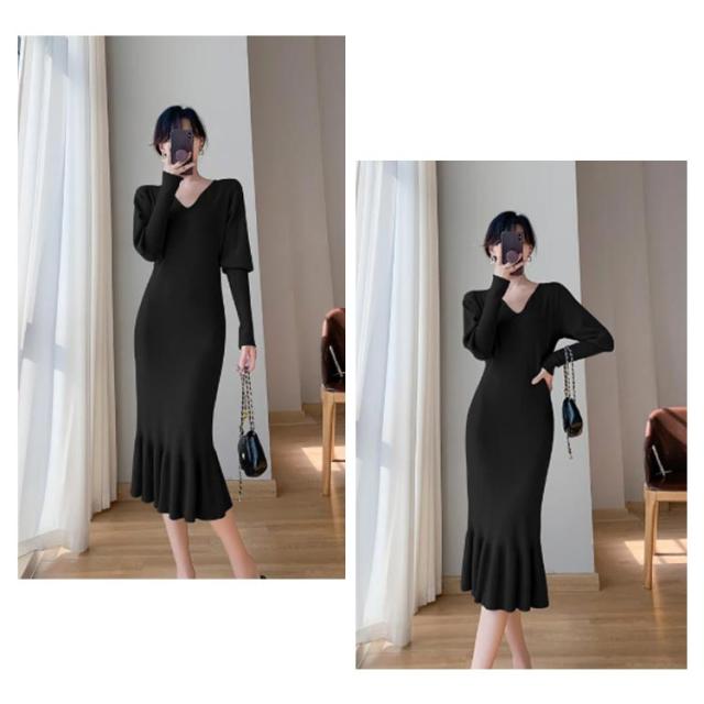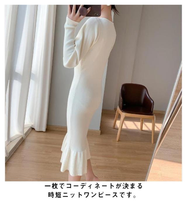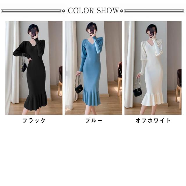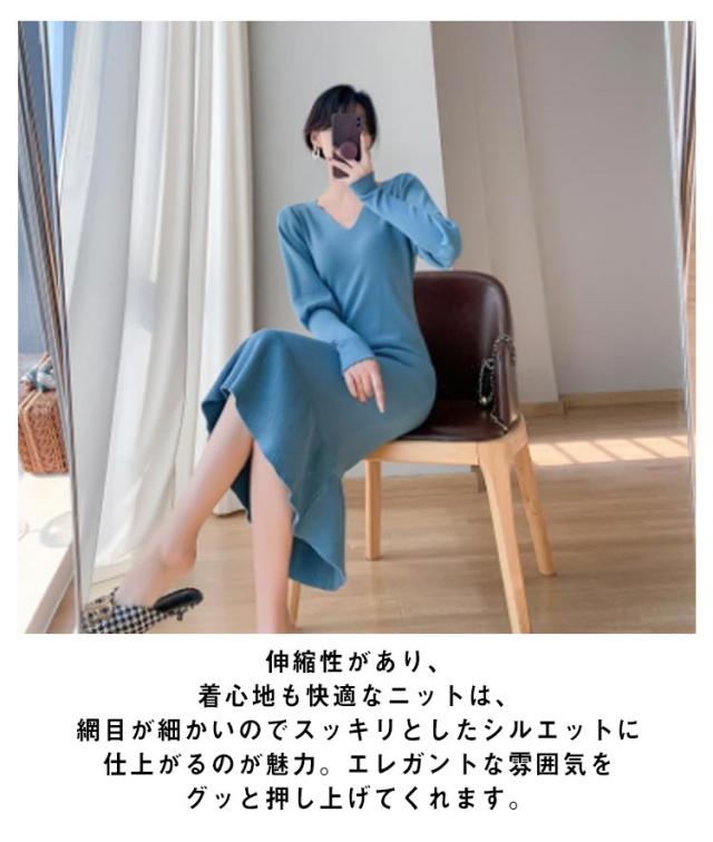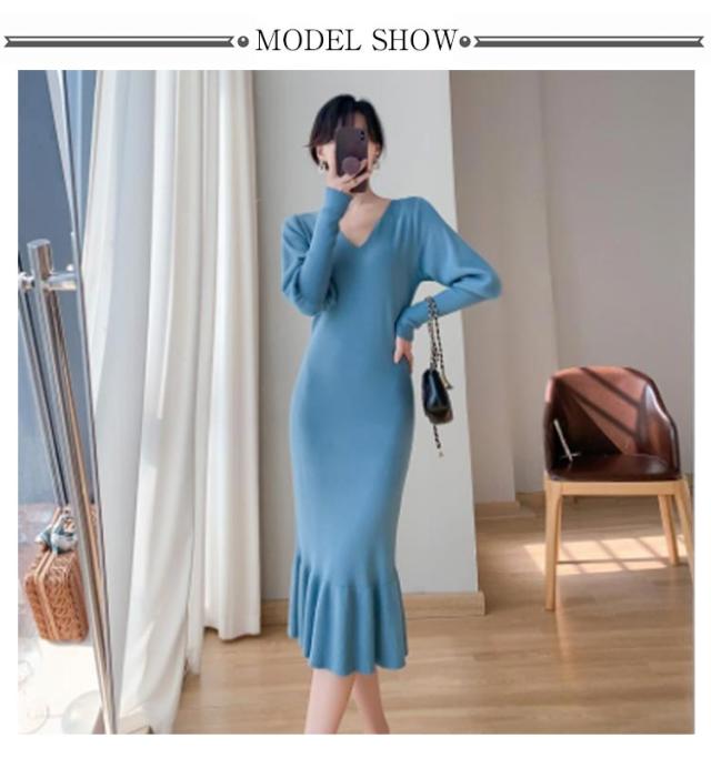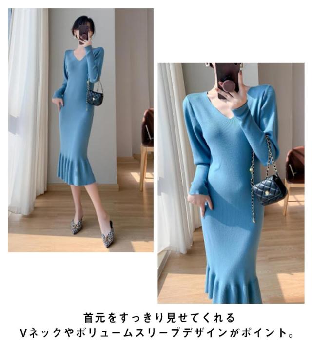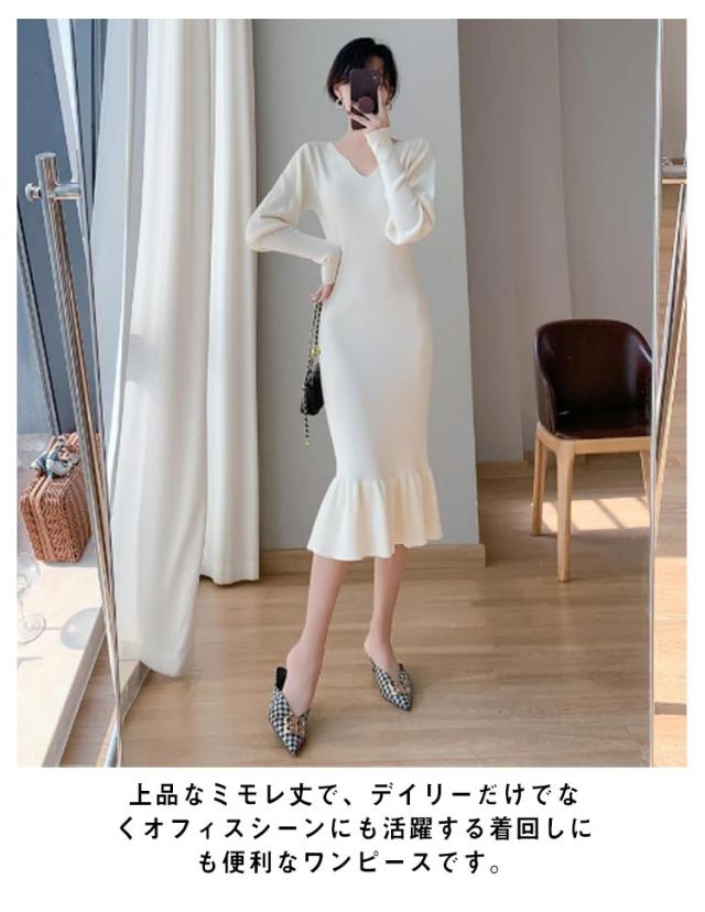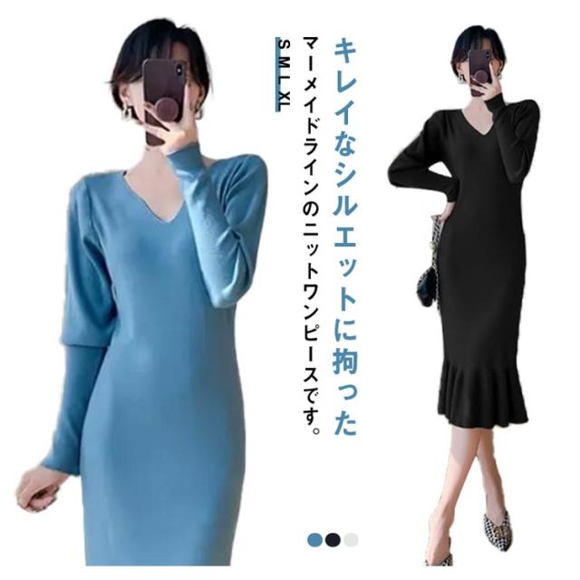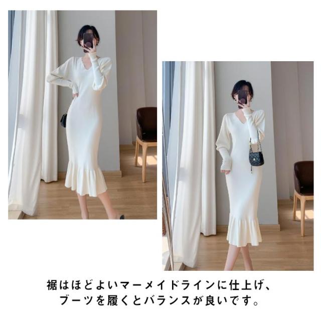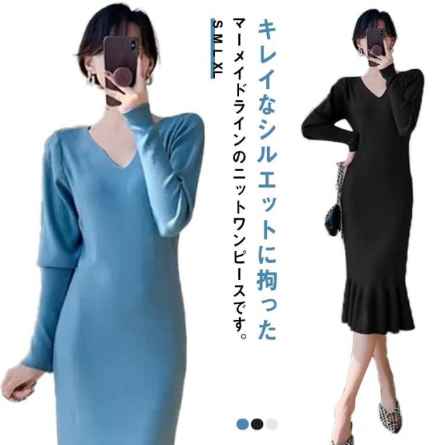 ニットワンピース マーメイド ニット ロングワンピース 長袖 Vネック タイト マーメイドシルエット きれいめ おしゃれ フェミニン 大人 可愛い オフィス 秋 冬 無地 全3色