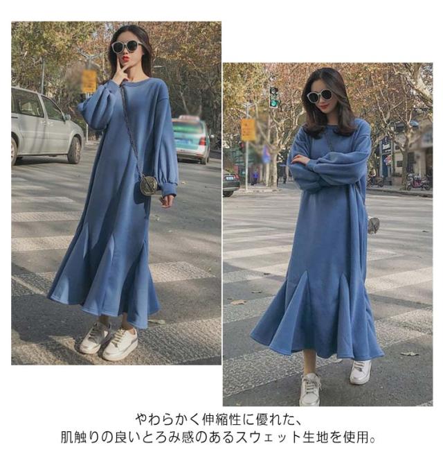 マーメイドワンピース パーカーワンピース レディース スウェット ワンピース ロングワンピース 長袖 丸首 ロング丈 マーメイド フレア ビッグシルエット ゆったり パーカー ワンピ