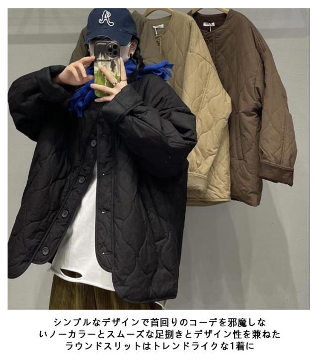 | 軽くて暖かい、中綿入りミドルコート。カジュアルにもきれいめにも着られるノーカラーキルティングコート。 シンプルなデザインで首回りのコーデを邪魔しないノーカラーとスムーズな足捌きとデザイン性を兼ねたラウンドスリットはトレンドライクな1着に◎ 軽い着心地でさっと羽織れ、スタイリッシュな印象に格上げしてくれます。 中綿入りで保温性が高く軽い素材! 長すぎない丈感なので、パンツはもちろん、ロングスカートとの合わせもおすすめ! | |