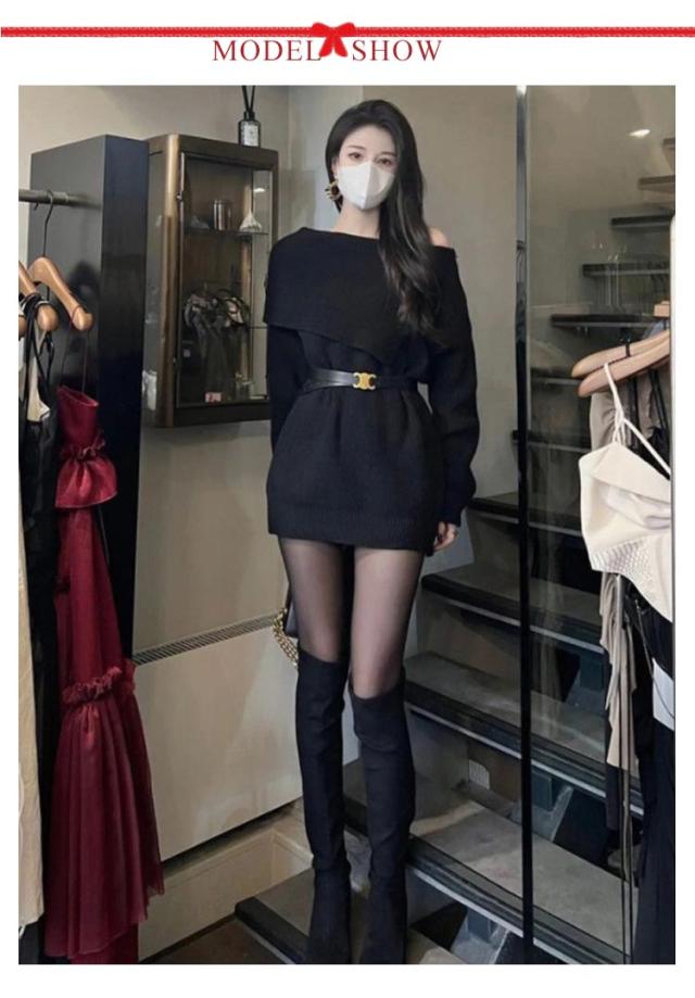 オフショルダー ニットワンピース 春秋冬 ワンピース レディース ショート丈 長袖 ワンピース ゆったり ベルト付き セクシー チュニック 肩出し きれいめ 二次会 結婚式 送料無料