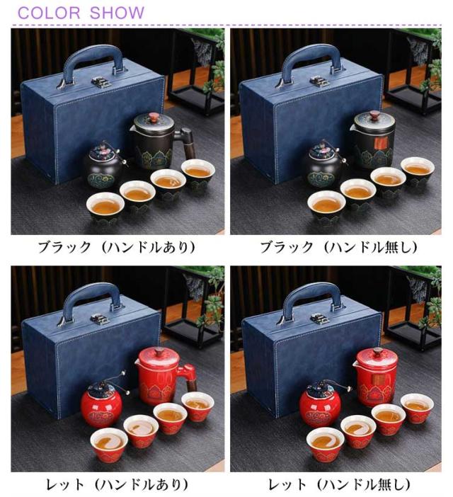 | 中国茶を楽しむための便利な茶器セットです。 茶壺(急須)、茶杯、茶筒、茶盤までセットになっているので、これひとつですぐに本格的なお茶を楽しむことができます。 専用の収納バッグに収められているので場所もとらず、持ち運びにも便利です。 くつろぎの時間やちょっとしたお持てなしの茶会にも。ひとつあると便利な茶器セットです。 ※茶壺は非常に熱くなります。火傷にはくれぐれもご注意ください。 セット内容:写真通り | |