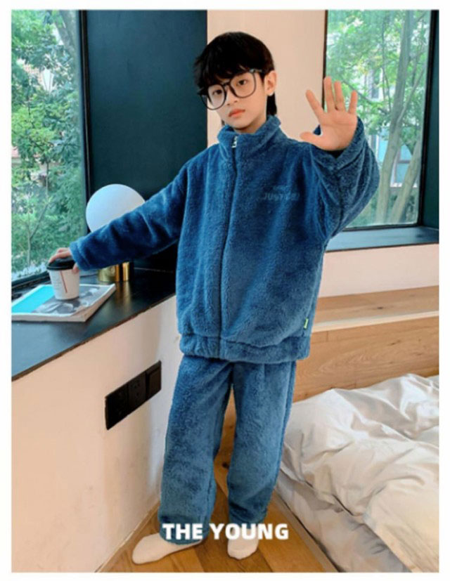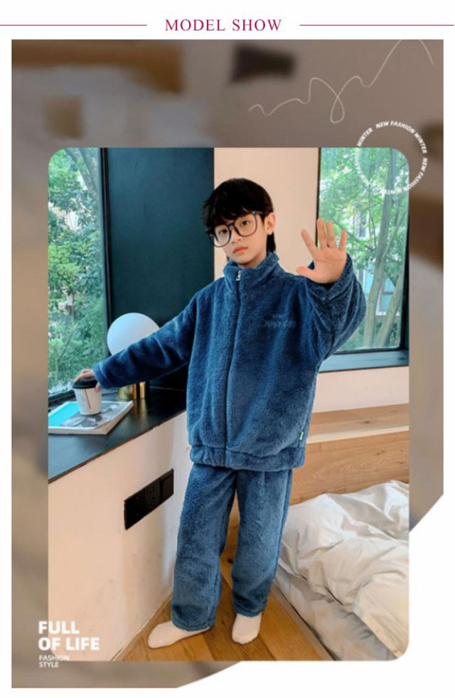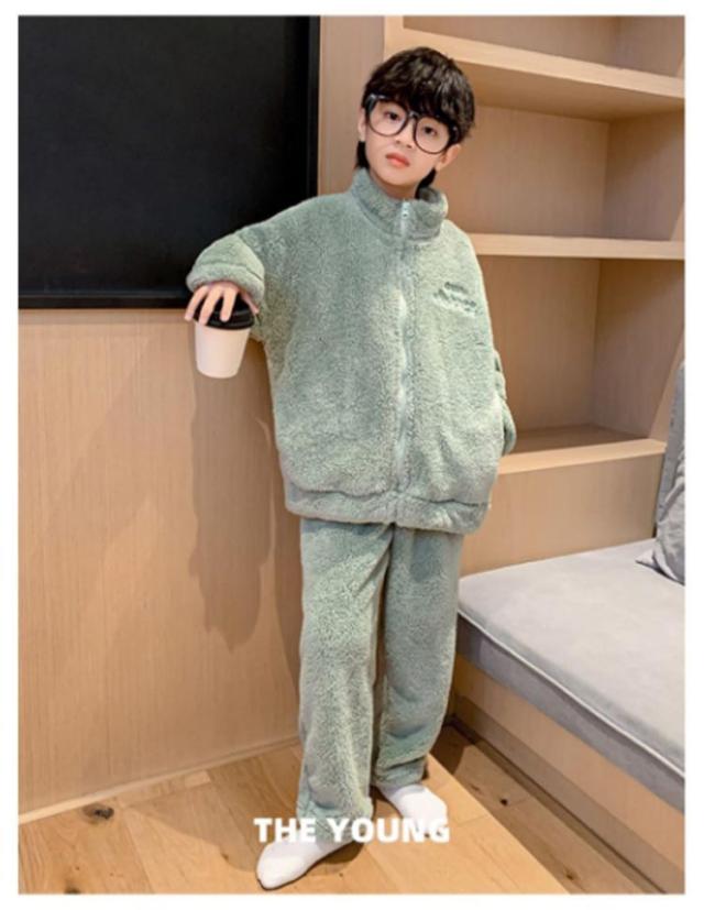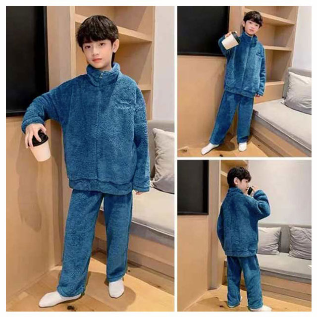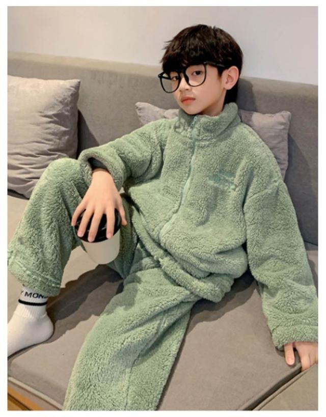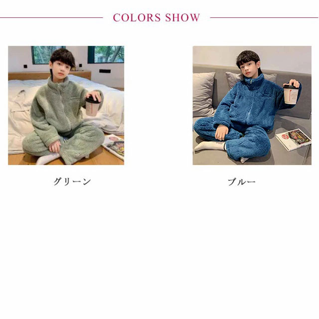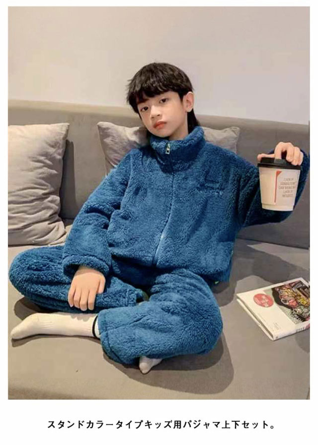 | スタンドカラータイプキッズ用パジャマ上下セット。 肌触りの良いのフリース素材なのであたたか。 冬のあったか部屋着に最適。 お泊り用のパジャマにもおすすめ♪ 毛玉になりにくいサンゴマイヤーフリース素材。 | |
