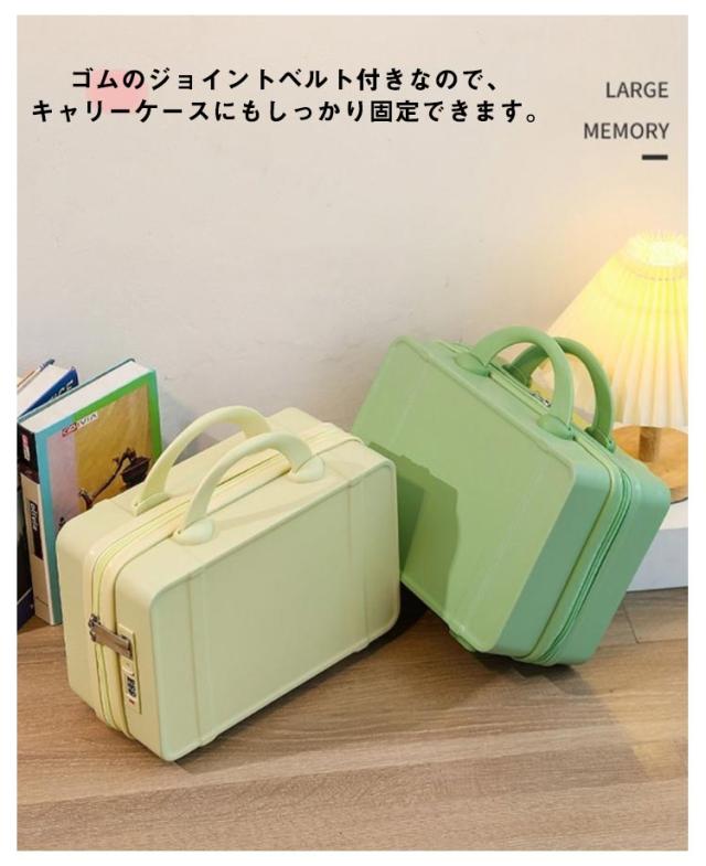 | 可愛くて使いやすいミニスーツケース 丈夫なPVC素材を使用しているので、突然の雨や何かをこぼしてしまった時もサッと拭いたらOK!面倒なお手入れもいりません。 ゴムのジョイントベルト付きなので、キャリーケースにもしっかり固定できます。 仕切りとメッシュポケットがついているから、荷造りがしやすいです。 シンプルなデザイン、豊かなカラーバリエーションはどんなキャリーケースにも合わせやすい♪ | |