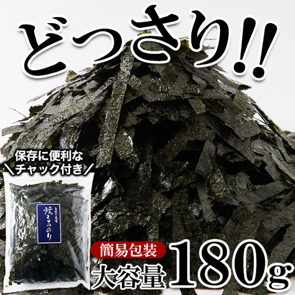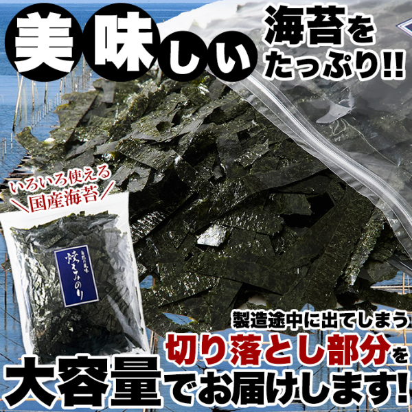パリッとした食感と磯の香り!風味と香りの良い原料を選別。国産(有明海産・瀬戸内海産)の美味しい海苔!製造途中に出てしまう切り落とし部分を大容量でお届けします。■焼もみのりとは?製造工程でできる切り落とし部分を使いやすいよう細かくした海苔のことです。細かくする際に手などで揉むことから「もみのり」と呼ばれています。形は不揃いですが、味も品質も通常の海苔と変わりません。たっぷり使えるので、常備しておくと便利です。保存に便利なチャック付き。■簡単!便利!いろいろ使える国産海苔!海苔の和え物、ざる蕎麦、卵かけご飯、サラダに袋から取り出してかけるだけ。