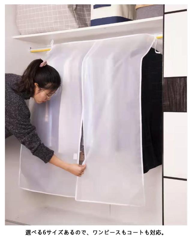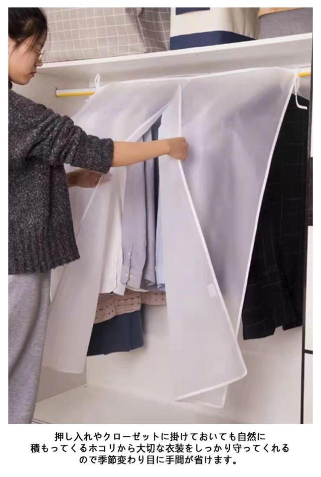 | 1着ずつカバーをかけるのがめんどくさいあなたにオススメ! ホコリを防ぎ、おしゃれに収納!押し入れに保存されてあるシーズンオフの衣類カバー。 両サイドのヒモをハンガーラックのパイプに結ぶことでカバーのズレを防止できます。 カバーを外さなくても、面ファスナー式だからいつでも取り出せます。湿気を遮断し、服へのカビの発生を防ぐ! カバーが透明なので、いちいち開けて確認しなくても、何が入っているか一目瞭然! 押し入れやクローゼットに掛けておいても自然に積もってくるホコリから大切な衣装をしっかり守ってくれるので季節変わり目に手間が省けます。 選べる6サイズあるので、ワンピースもコートも対応。 | |