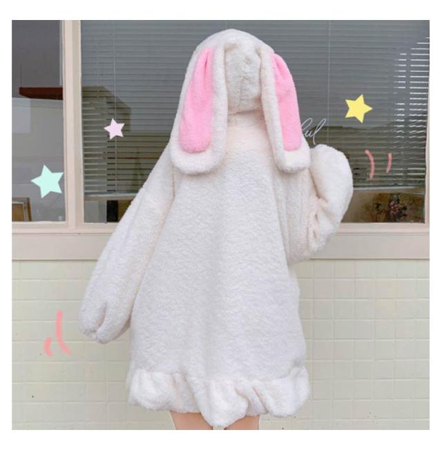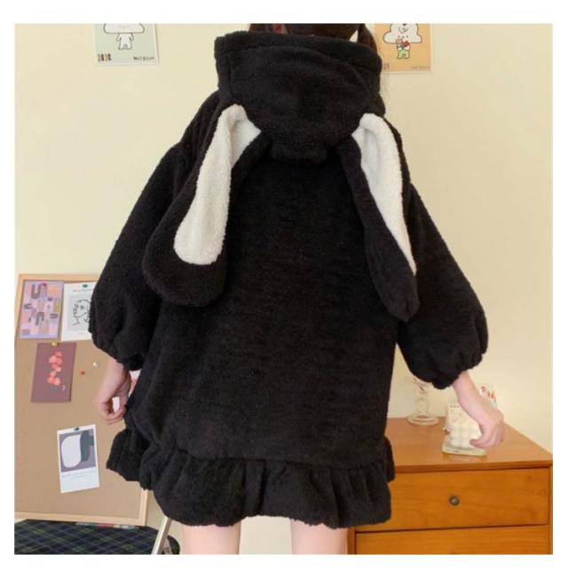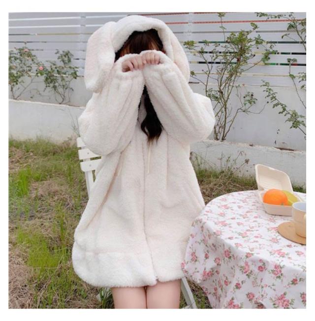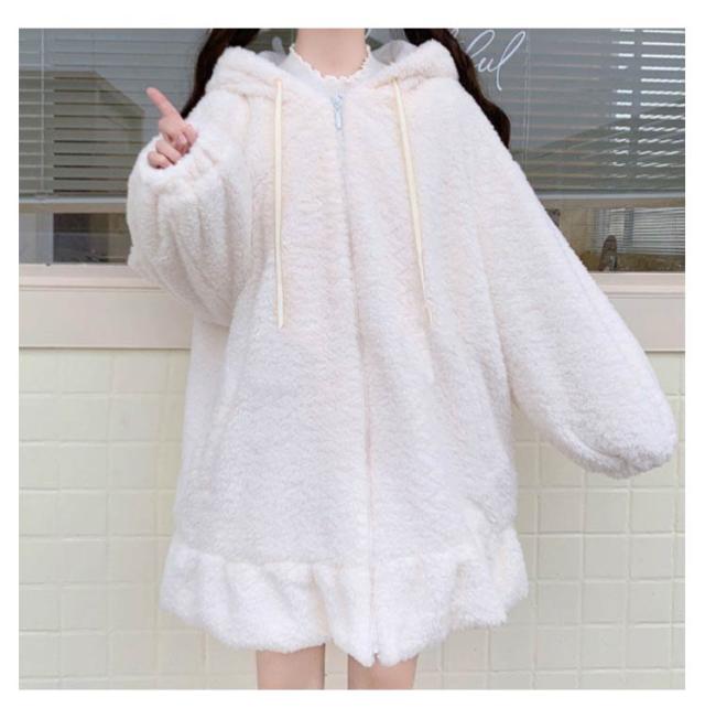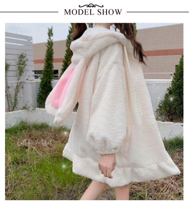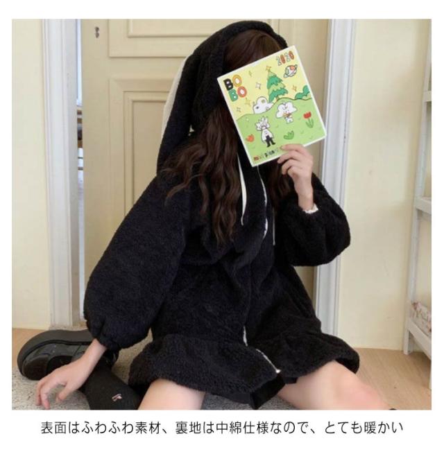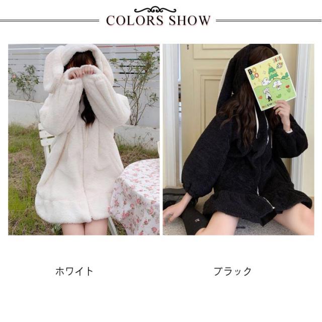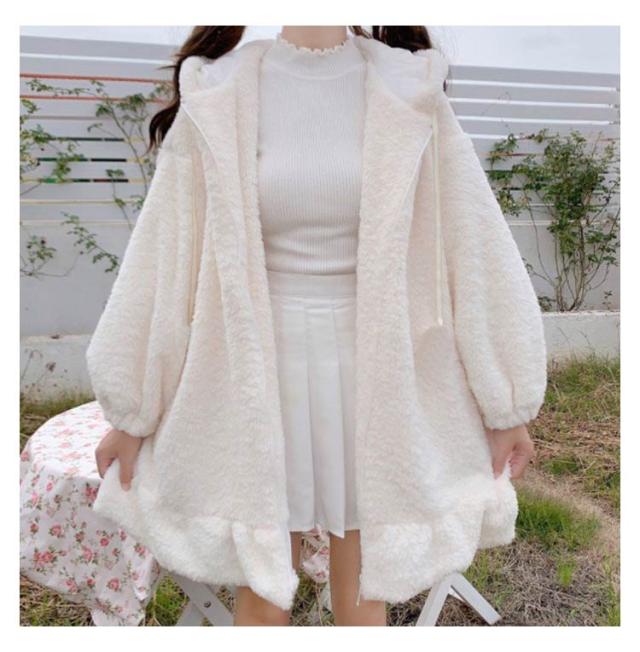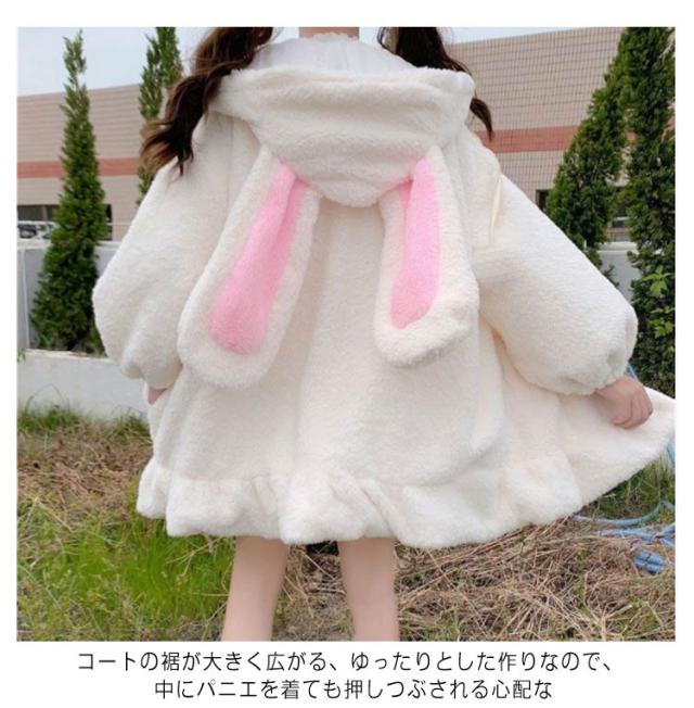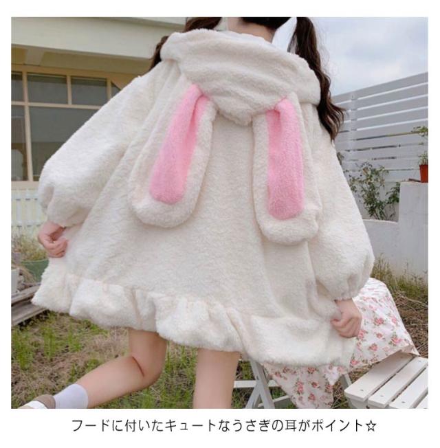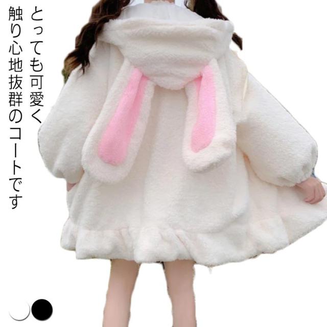 | とっても可愛く触り心地抜群のコートです 表面はふわふわ素材、裏地は中綿仕様なので、とても暖かい フードに付いたキュートなうさぎの耳がポイント☆ コートの裾が大きく広がる、ゆったりとした作りなので、 中にパニエを着ても押しつぶされる心配な 季節感のある今年らしいスタイリングを叶えてくれます | |