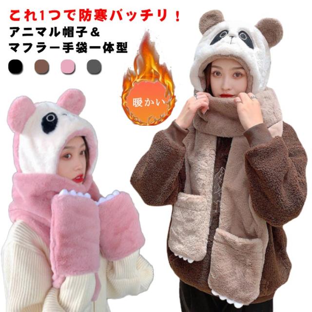 フード付きマフラー アニマル帽子 マフラー手袋一体型 レディース パンダ顔 アニマル柄 ファーマフラー 女子 厚手 可愛い 防寒 暖かい フリーサイズ 秋 冬 全4色