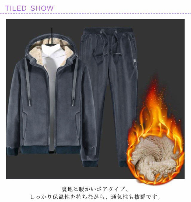 | 裏ボアタイプの暖かいスウェット上下セットです。 サイズ展開はS〜5XLまでの8サイズ展開です。 シングルファスナー正面開きで、紐で絞り調整ができるフードがついています。 裏地は暖かいボアタイプ、しっかり保温性を持ちながら、通気性も抜群です。 | |
