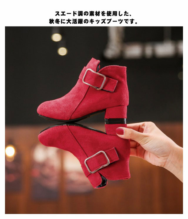 ショートブーツ キッズ ジュニア ベルト 女の子 おしゃれ 太ヒール 子供 靴 可愛い プレゼント 卒園式 七五三 ピンク 黒 ブラック レッド 赤 スエード かわいい 裏起毛タイプあり 防寒 シューズ
