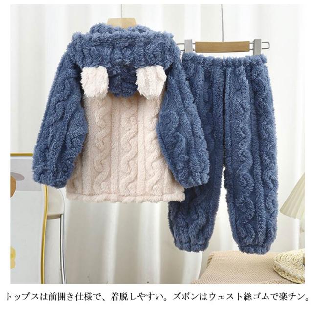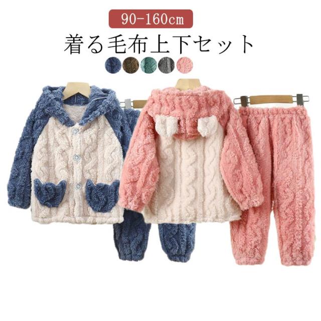 着る毛布 上下セット キッズ ルームウェア 90 パジャマ セットアップ 子供 着ぐるみ 部屋着 もこもこ 130 160 長袖 秋冬 耳付きフード ウェストゴム 前開き マイクロフリース 女の子 男の子
