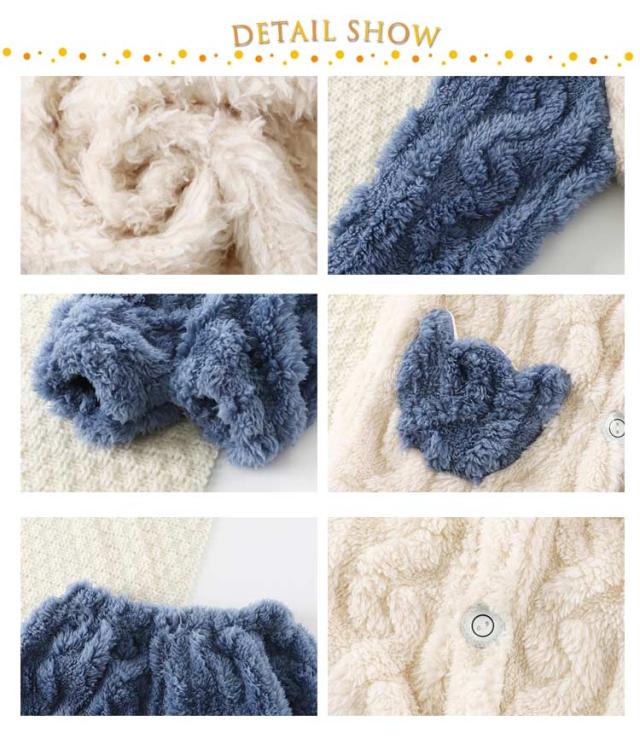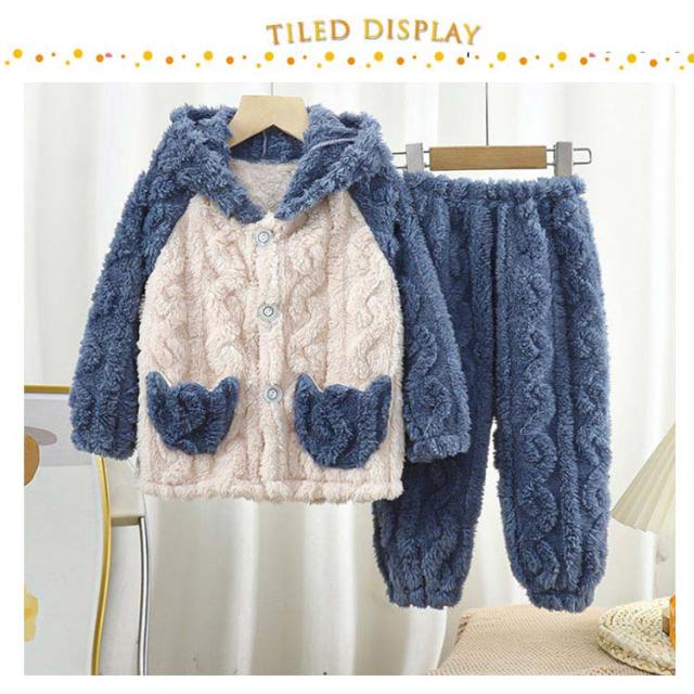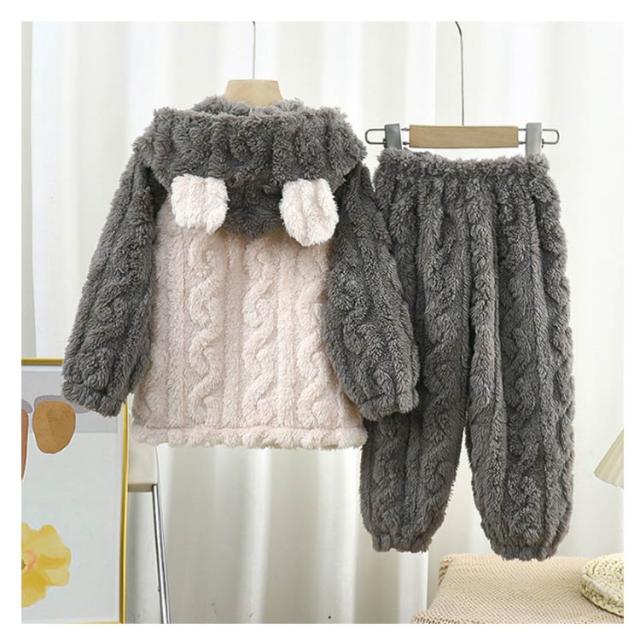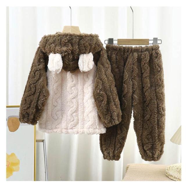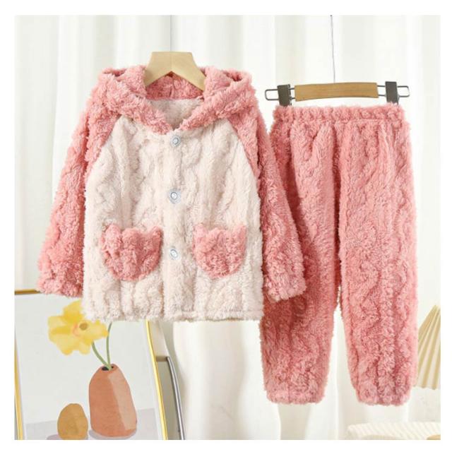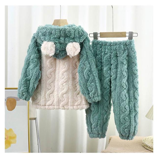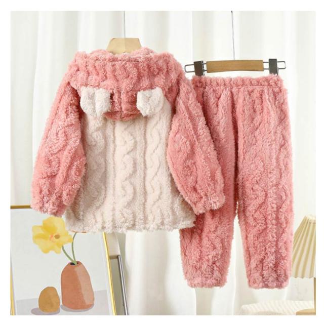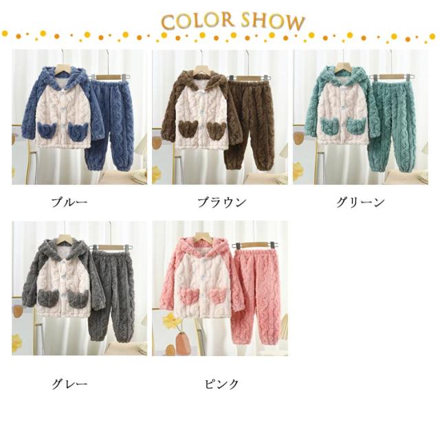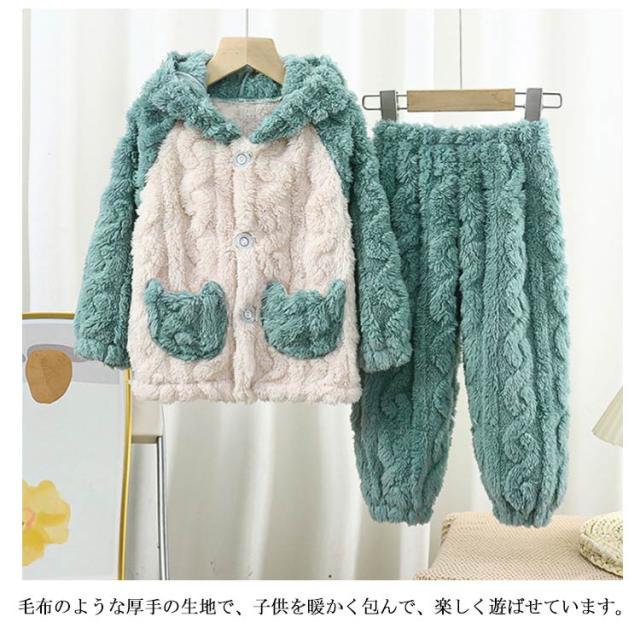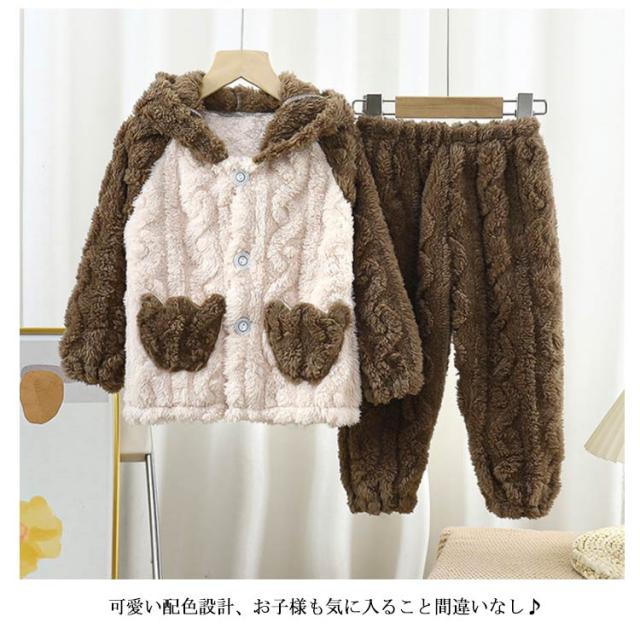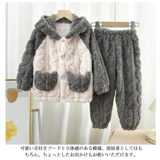 | ふんわり、柔らかなフランネルパジャマは寒い日には欠かせないマストアイテム。 トップスは前開き仕様で、着脱しやすい。ズボンはウェスト総ゴムで楽チン。可愛い配色設計、お子様も気に入ること間違いなし♪ 毛布のような厚手の生地で、子供を暖かく包んで、楽しく遊ばせています。 可愛い耳付きフードと立体感のある模様、部屋着としてはもちろん、ちょっとしたお出かけもお使いいただけます。 | |