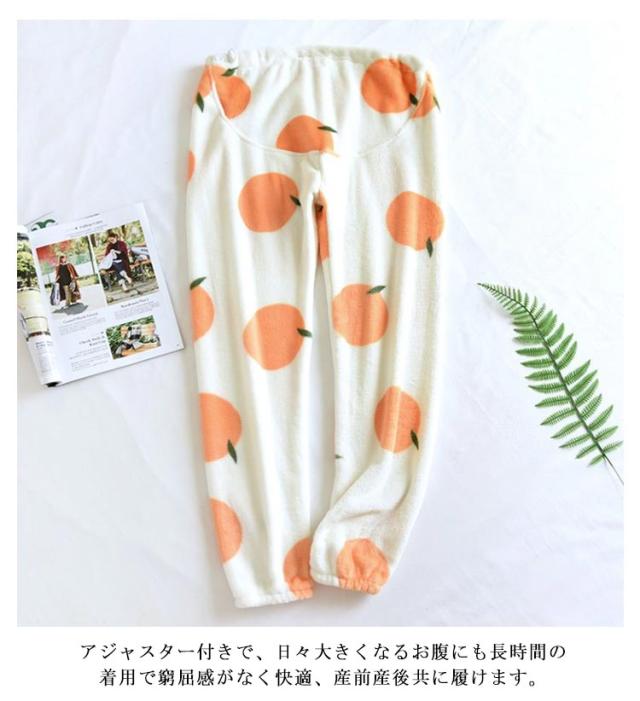 もこもこ ふわふわ マタニティ ルームパンツ 裏起毛 可愛い オレンジ柄 ウエスト調整可能 長ズボン ロング 暖かい あったか 無地 おしゃれ 秋 冬 春 マタニティウェア ルームウェア