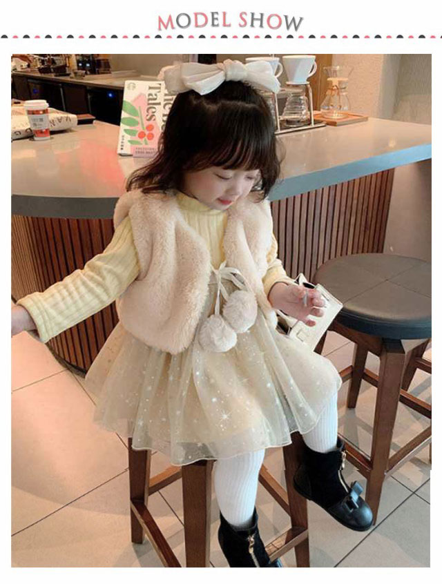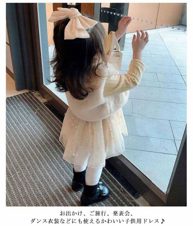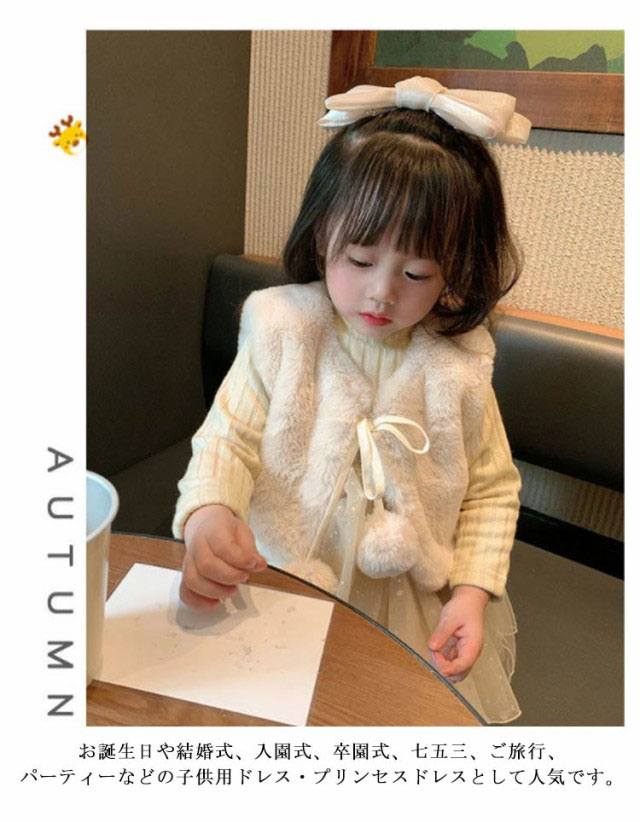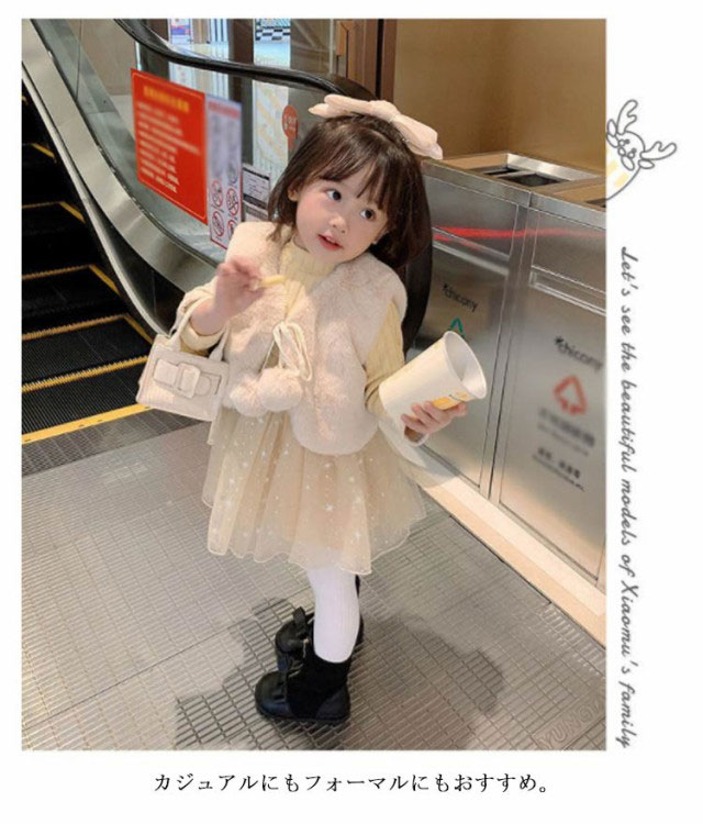 | フェイクファーのベスト+ワンピースのお得な2点セット! お誕生日や結婚式、入園式、卒園式、七五三、ご旅行、パーティーなどの子供用ドレス・プリンセスドレスとして人気です。 お出かけ、ご旅行、発表会、ダンス衣装などにも使えるかわいい子供用ドレス♪ カジュアルにもフォーマルにもおすすめ。 トップスは伸縮性のあるカットソー。 裏が起毛しているので1枚でも暖かいです。 スカート部分はキラキラのラメ模様のチュールが可愛い★3枚仕立てできれいなボリュームがでます。 チュールの下は起毛素材のスカートなので暖かく肌に直接当たらないので子供でも安心です。 ウエスト部分はゴム入りなので、良く伸び着やすく楽ちんです♪ ベストはふわふわの気持ちいい肌触りのフェイクファーのベスト。可愛いボンボンが特徴です。 ベストも裏起毛で暖かい。お手持ちの洋服と合わせてベスト単体でもお楽しみ頂けます。 ベストとワンピースが別々なので、それぞれお手持ちの洋服ともコーデをお楽しみ頂けます。 春先にはワンピース1枚で、冬にはカーディガンなどを合わせて、春秋冬と便利に使えるお得なアイテムです バースデイプレゼント ( バースデープレゼント )や、お子様、お孫さん、小学生、保育園、幼稚園生へのギフトやお祝い、贈り物として♪ | |