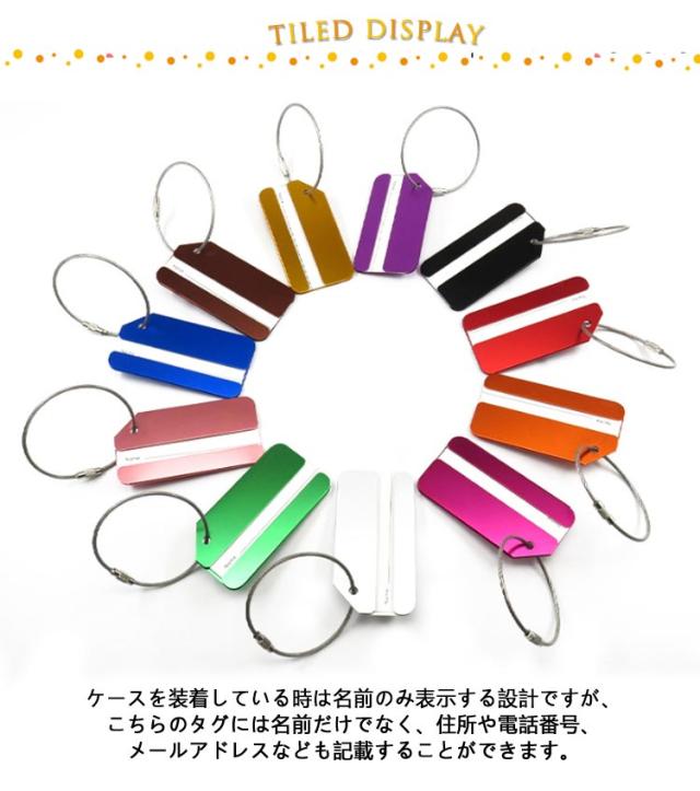 | 10点セット アルミ合金素材を採用してつくられた耐久性抜群のネームタグセットです。 ケースを装着している時は名前のみ表示する設計ですが、こちらのタグには名前だけでなく、住所や電話番号、メールアドレスなども記載することができます。 ワイヤーで取り付けるタイプ。 | |