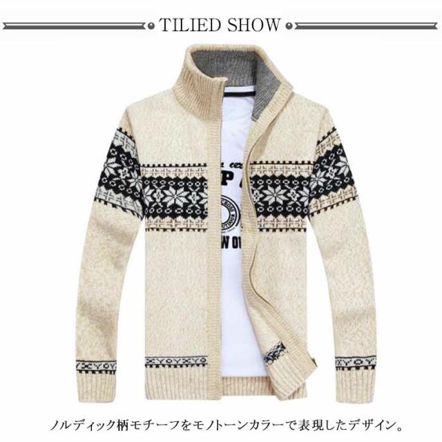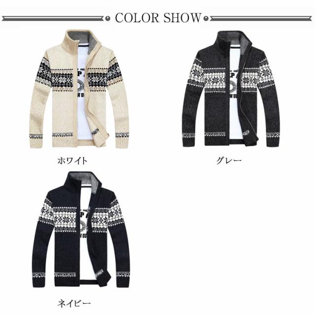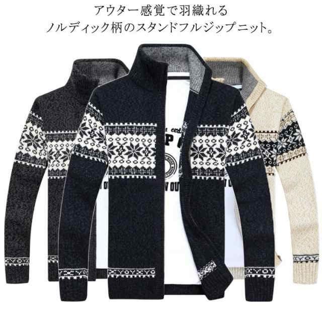 メンズカーディガン ニット セーター メンズ ジップアップ スタンドカラー 長袖 前開き ファスナー ノルディック柄 厚手 トップス アウター カジュアル 防寒 アウトドア 暖かい 男性 紳士用 秋 冬 全3色