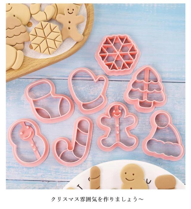 | 8個セット、いろんな柄があり、揃う手間を省く。 スタンプだからしっかり模様がついて簡単にかわいいクッキーの出来上がり。 クリスマス雰囲気を作りましょう〜 | |