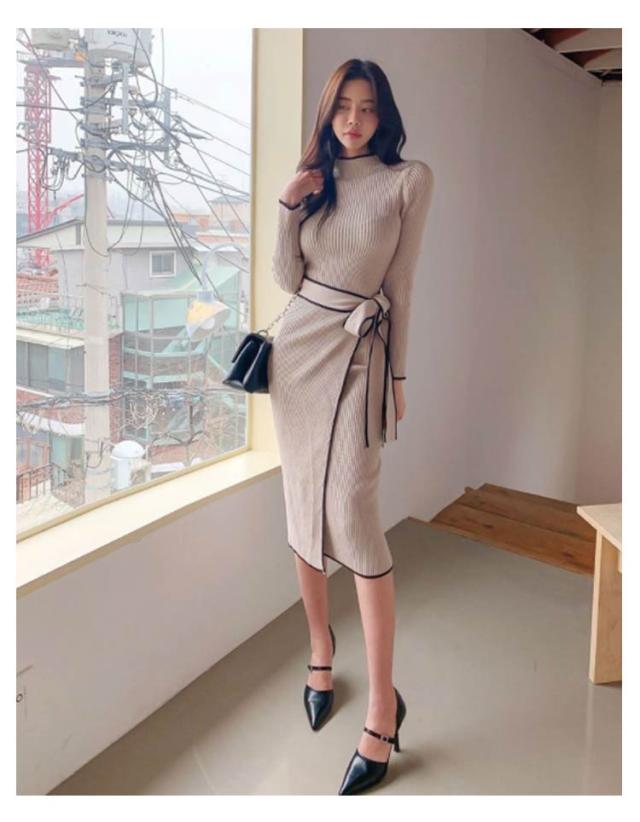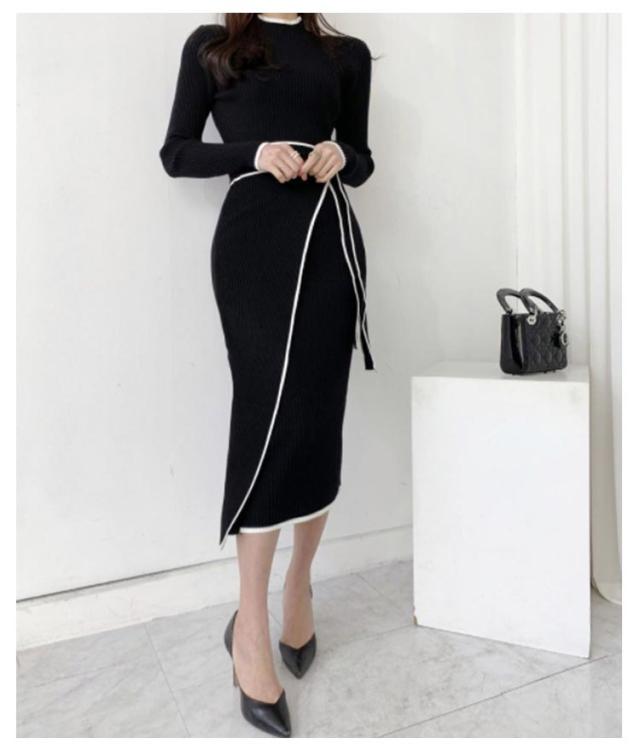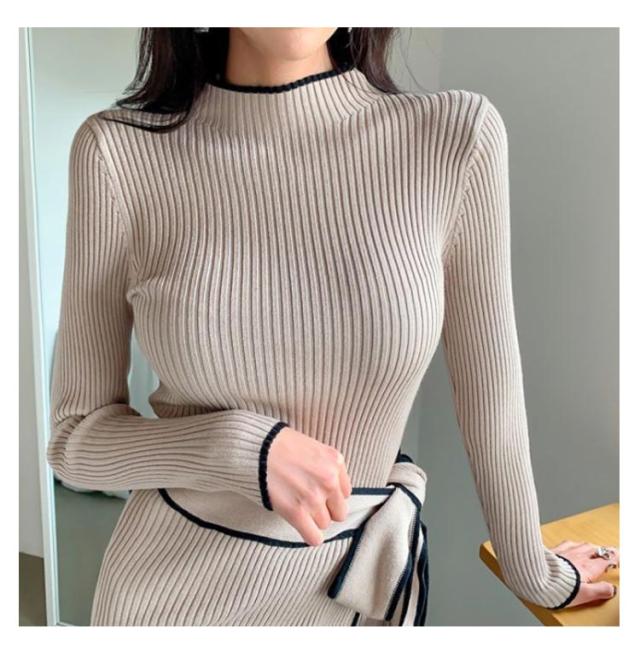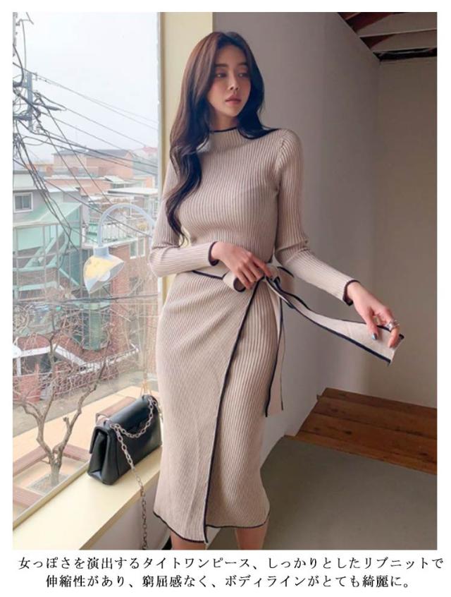 ワンピース ニットワンピース 冬 秋 ロングワンピース タイト レディース きれいめ 配色 リボン フェミニン ミモレ丈 春コーデ 秋コーデ 冬コーデ リブニット 韓国ファッション モックネック ins映え