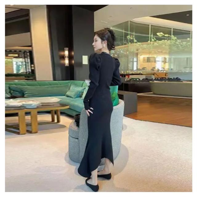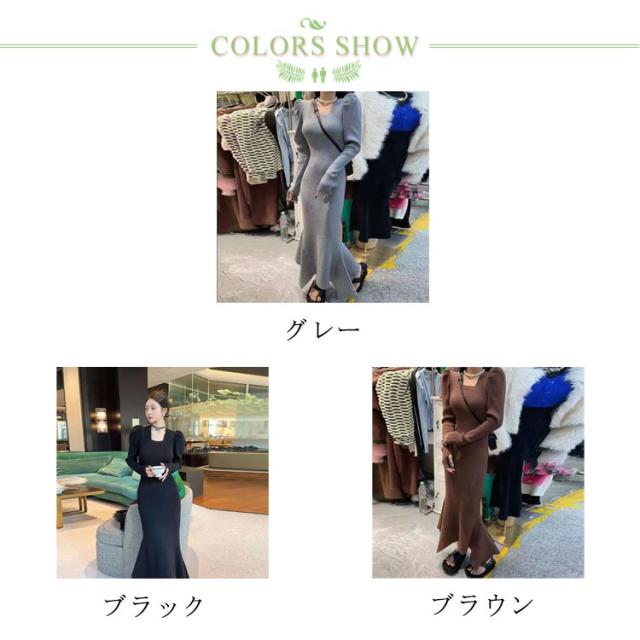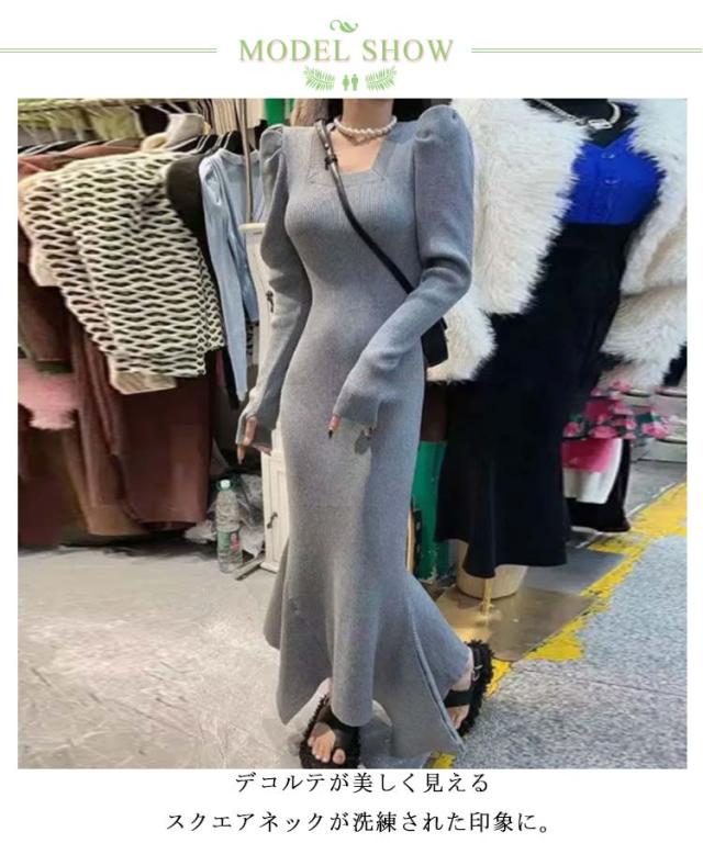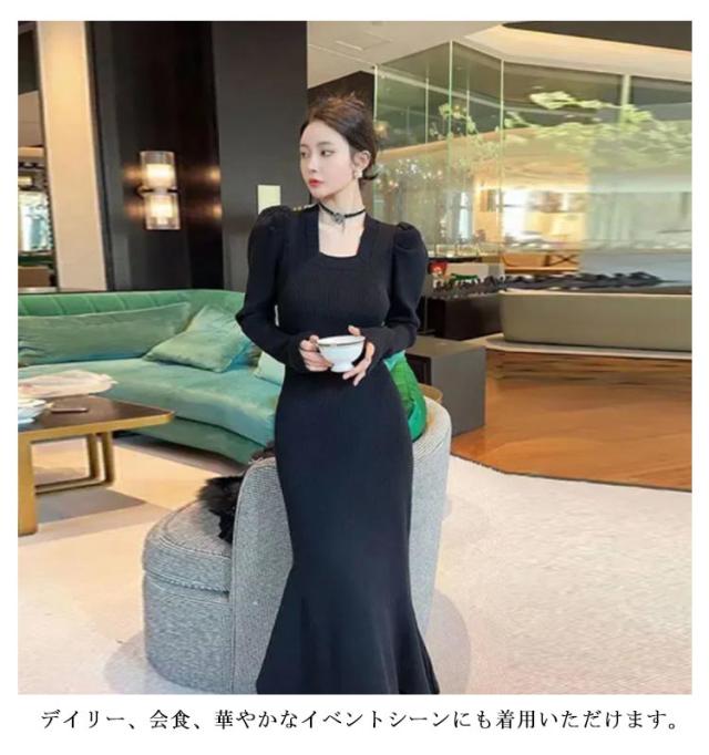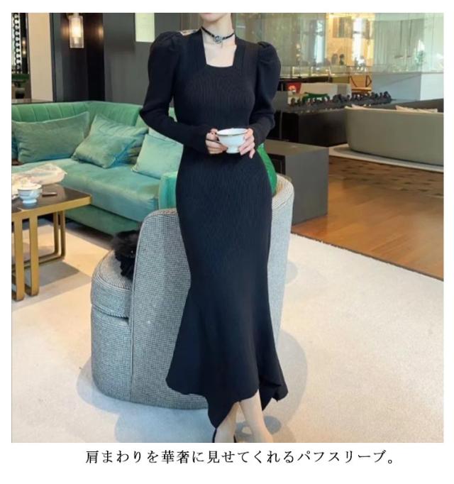 マーメイドワンピース オーガンスリーブ マーメイド ニット ワンピース タイトワンピース ロングワンピース スクエアネック ボリューム袖 パフスリーブ 上品 大人 かわいい おしゃれ フォーマル 二次会
