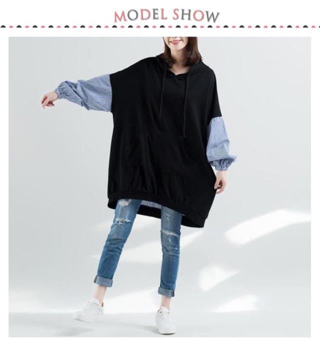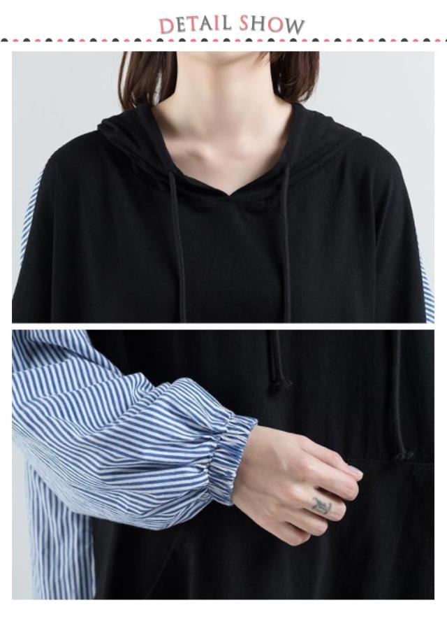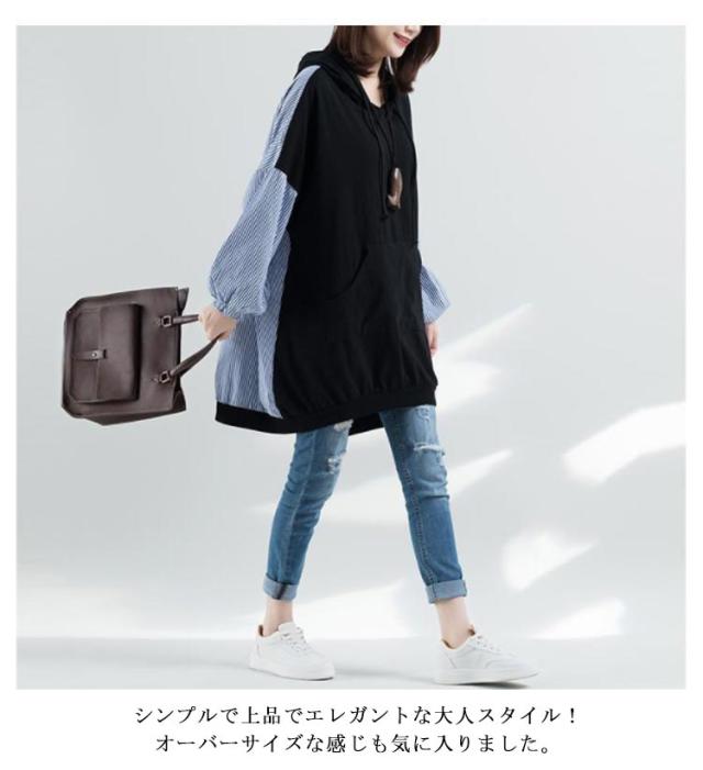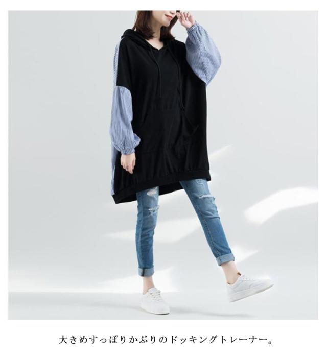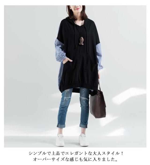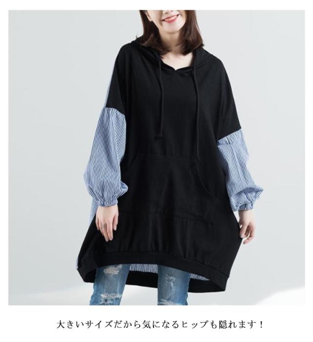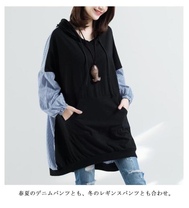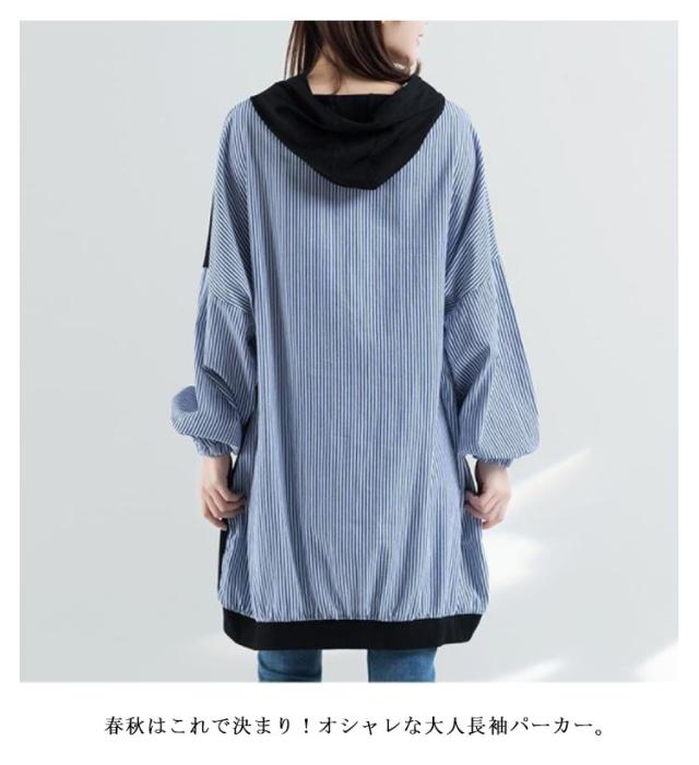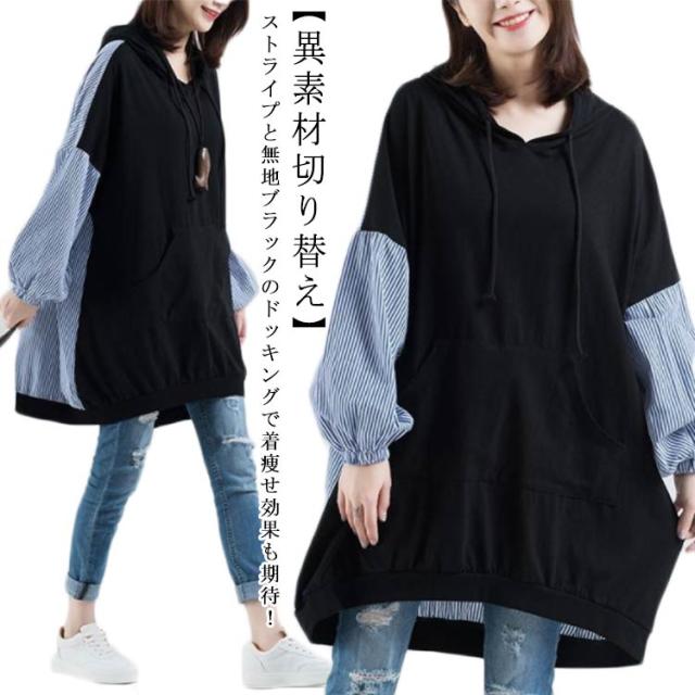 ロング丈 パーカー レディース 異素材切り替え ストライプ トップス スウェット 長袖 フード付き プルオーバー 春秋 ゆったり オーバーサイズ 体型カバー 着痩せ カジュアル 可愛い 通勤 大きいサイズ