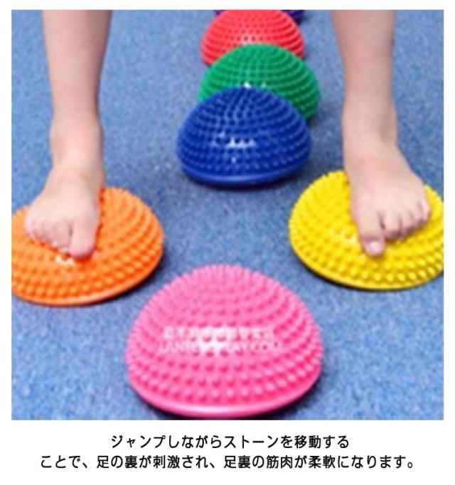 | 遊びながら自然にバランス感覚や体幹などの運動能力を高めることができる遊具です。 バランスを取りながらストーンからストーンに飛び移ることで自然にバランス感覚が養われ、体感が鍛えられます。 ジャンプしながらストーンを移動することで、足の裏が刺激され、足裏の筋肉が柔軟になります。 運動能力をアップさせるには、足裏を日常的に刺激して感覚を鋭くすることが重要です。 幼少期から足裏や足の指を刺激し、感覚を鍛えることは、運動能力向上においてとても大切なことなのです。 歩いて渡るだけでなく、ジャンプしたり、カラーを活用し指定した色に飛び移るなど、どうやって遊ぶかをお子さま自身で考えることができます。 ご家庭での遊びを兼ねたトレーニングはもちろん、幼稚園や保育園、児童館、学童保育、小学校、幼児体育教室など、様々なシーンでご活用いただけます。 | |