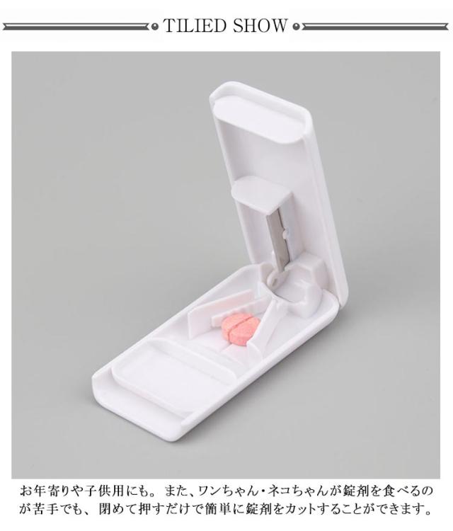 | 1,【簡単にカット】 大きくて飲みにくい錠剤を簡単にカット!お年寄りや子供用にも。 また、ワンちゃん・ネコちゃんが錠剤を食べるのが苦手でも、 閉めて押すだけで簡単に錠剤をカットすることができます。 2,【使い方簡単】 使い方はとっても簡単で、錠剤を所定の位置にセットし、 フタを閉めて押させるだけで簡単にカットすることができます。 3,【人間工学に基づいたデザイン】 素材は耐久性に優れたABS樹脂を採用、長持ちという特徴があります。 カッターはステンレス製カッターを採用し、より衛生的に割ることができます。 カットした後はフタを開けずに裏の小窓から簡単に錠剤を取り出せます。 また、錠剤収納スペースも備えており、持ち運びにもとても便利です。 | |