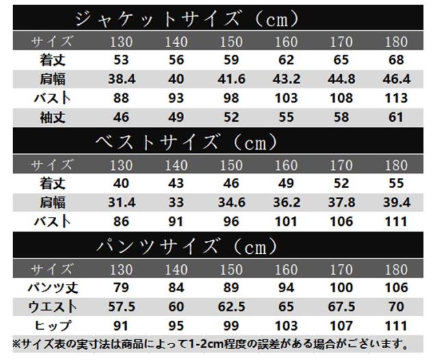 | サイズについての説明 | 表記の通り/セット内容:ジャケット+ベスト+パンツ+シャツ+ネクタイ |