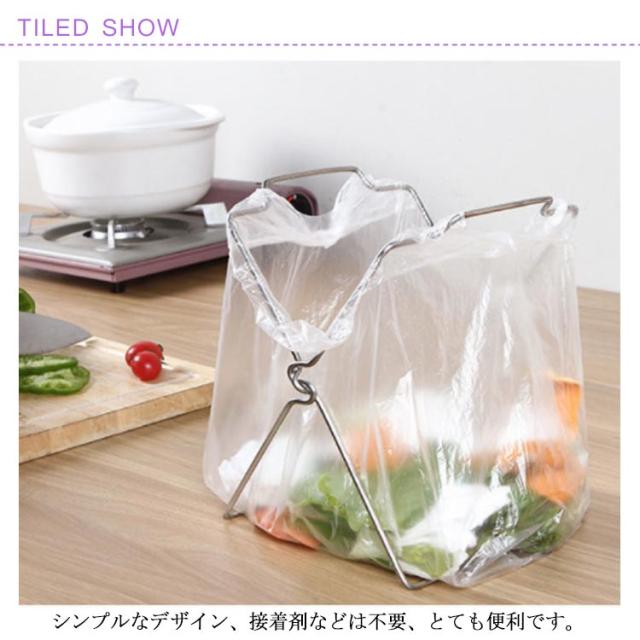 | 調理中に出たゴミをサッと捨てられるレジ袋ハンガー式のゴミ箱。 シンプルなデザイン、接着剤などは不要、とても便利です。 折り畳み式なので使わない時は折り畳んで収納すれば邪魔にならなく、スッキリ省スペースです。 大きく口が開くので、ゴミをラクラク捨てられます。たたんで口を閉じると、臭いが出るのを防げます。 | |