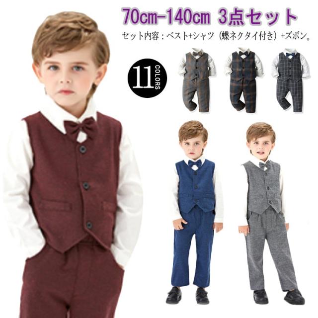 子供服 キッズ フォーマル スーツ ブレザー 男の子 ベビー服 3点セット 蝶ネクタイ付き シャツ/ベスト/パンツ 卒園式 入園式 七五三 お宮参り スーツ 無地 チェック柄 タキシード風 結婚式 ベビー スーツ 70 80 90 100 110 120 130 140