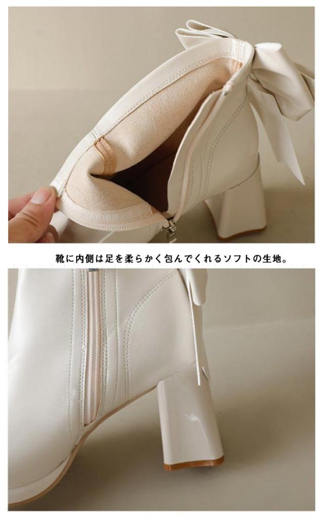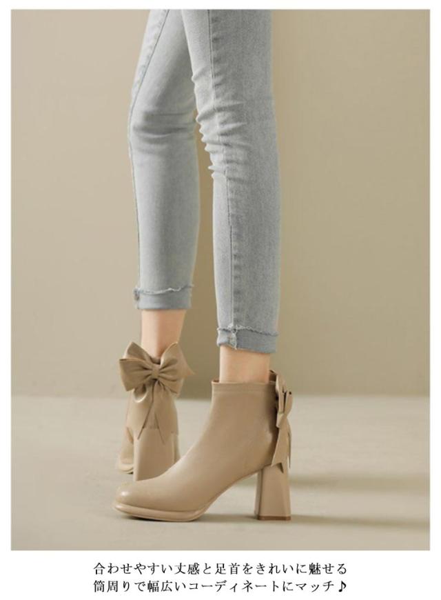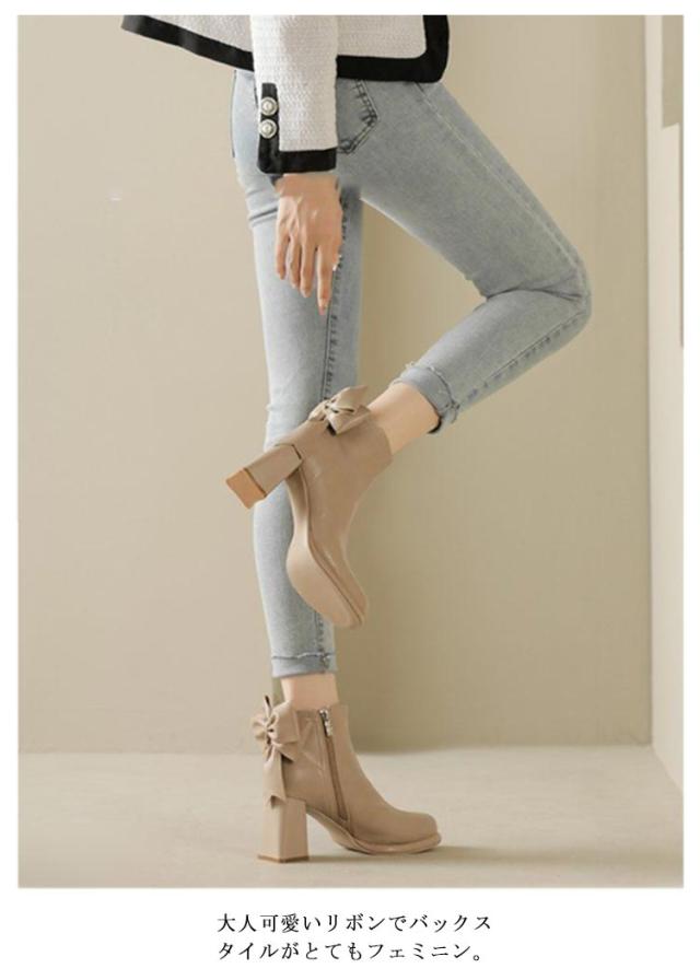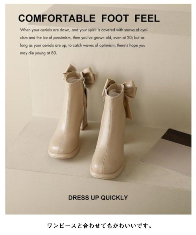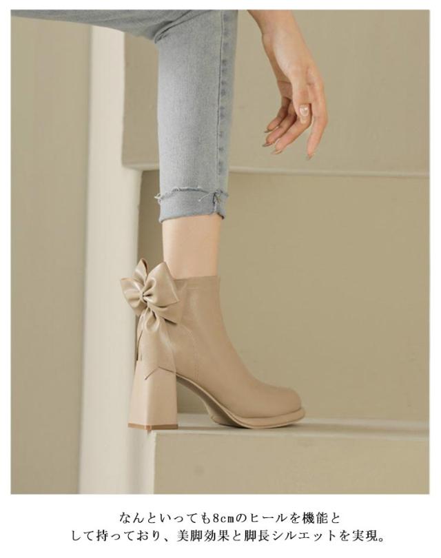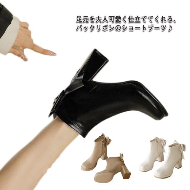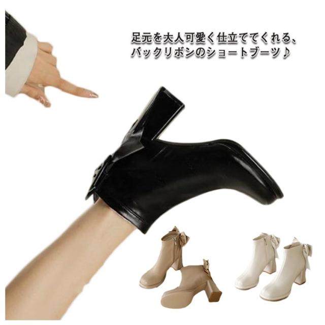 ブーツ レディース ショートブーツ スクエアトゥ ハイヒール 太ヒール バックリボン 靴 歩きやすい 高見え 防滑ソール サイドファスナー ふわふわ 低反発 インソール 大きいサイズ フェイクレザー カジュアル きれいめ 防寒 靴 美脚 フェミニン 通勤 オフィス 22cm 24.5cm