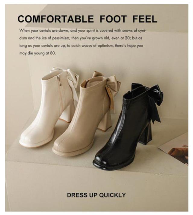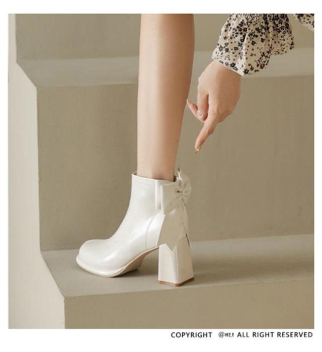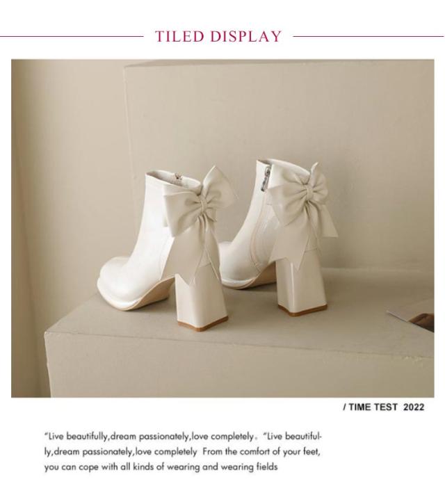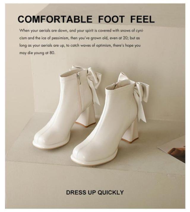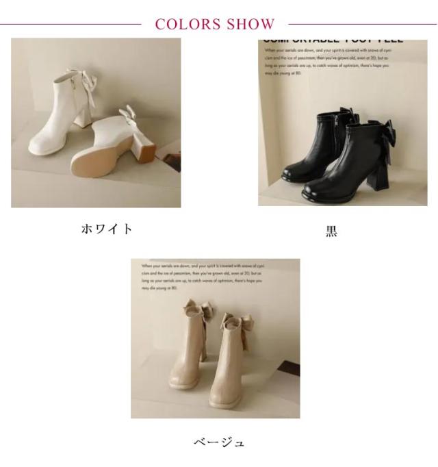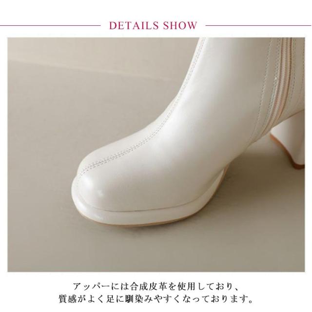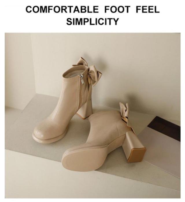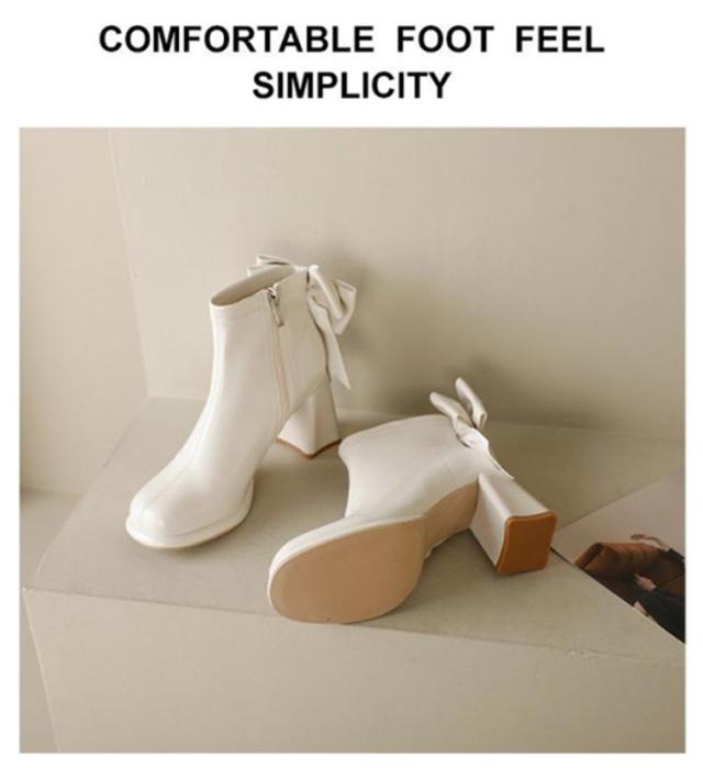 ブーツ レディース ショートブーツ スクエアトゥ ハイヒール 太ヒール バックリボン 靴 歩きやすい 高見え 防滑ソール サイドファスナー ふわふわ 低反発 インソール 大きいサイズ フェイクレザー カジュアル きれいめ 防寒 靴 美脚 フェミニン 通勤 オフィス 22cm 24.5cm