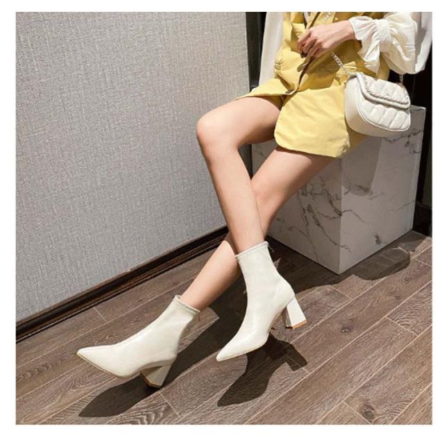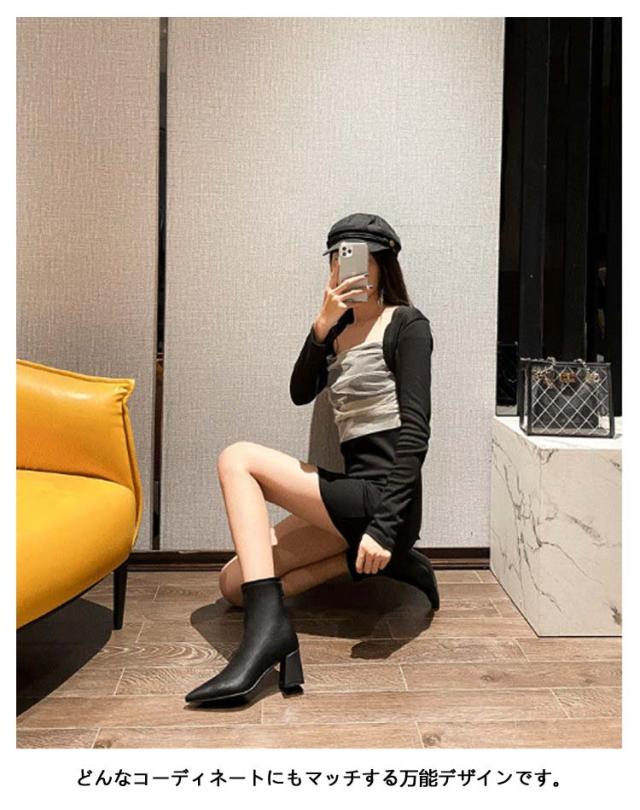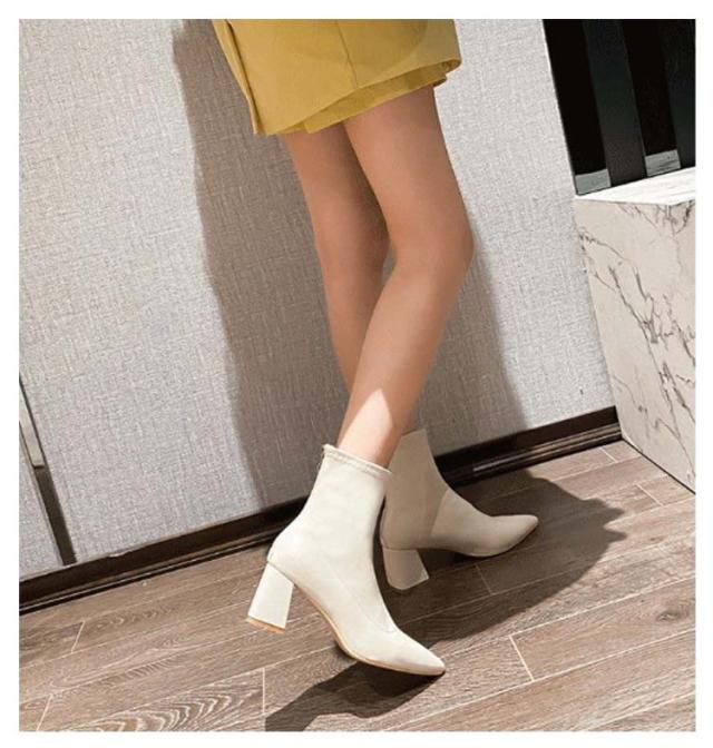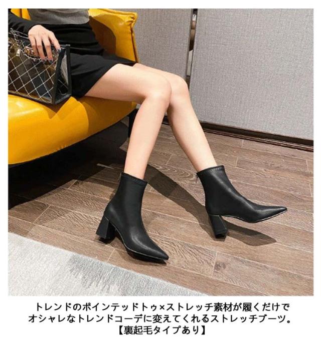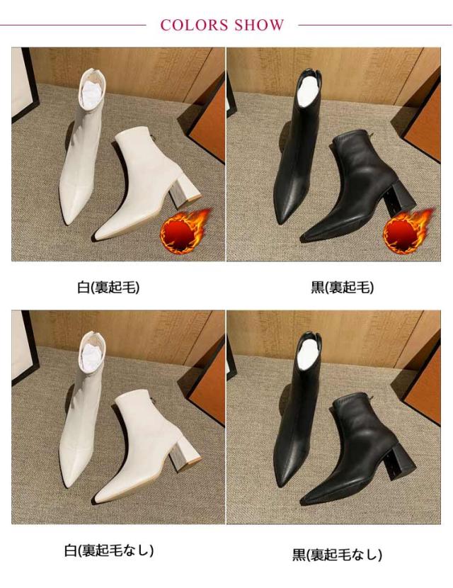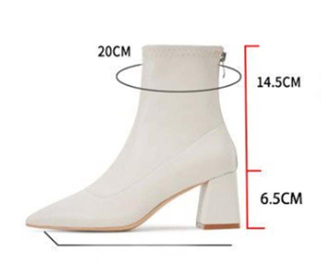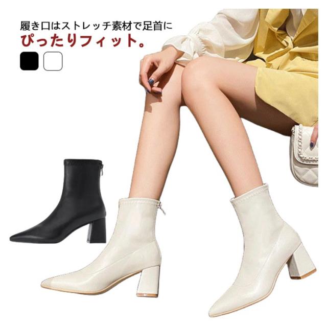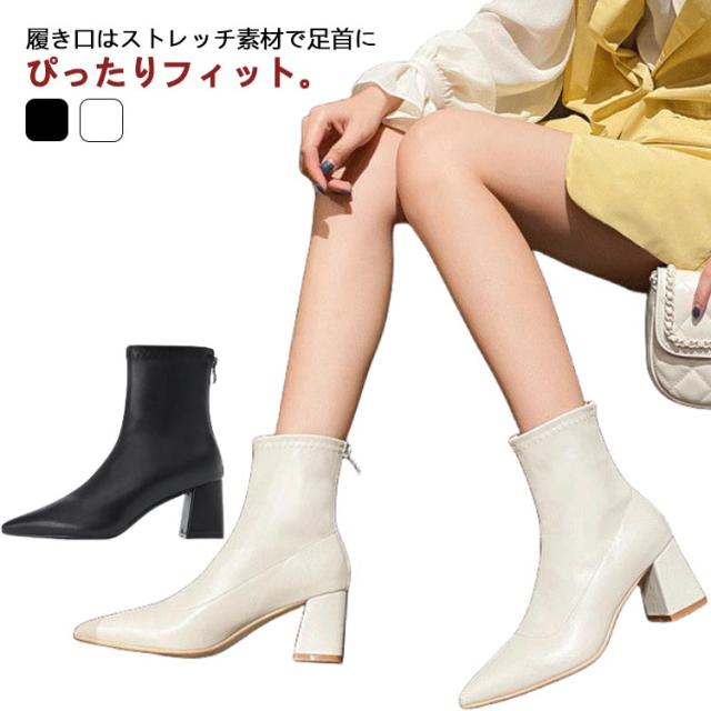 6.5cmヒール ブーツ レディース ショート ストレッチ 伸縮 ポインテッドトゥ ショートブーツ チャンキーヒール 太ヒール ソックスブーツ バックアップ バックファスナー 歩きやすい 履きやすい 防寒 ブラック 黒 白 ホワイト 通勤 オフィス 大人 きれいめ