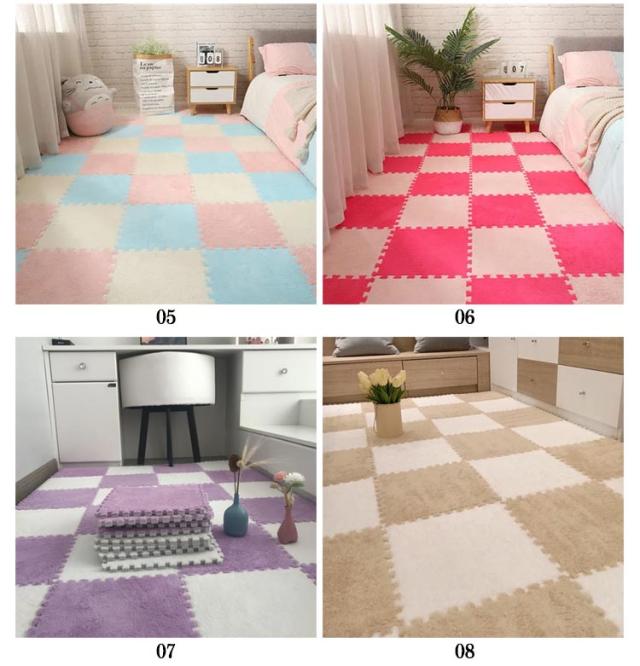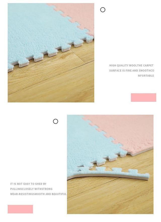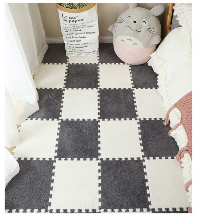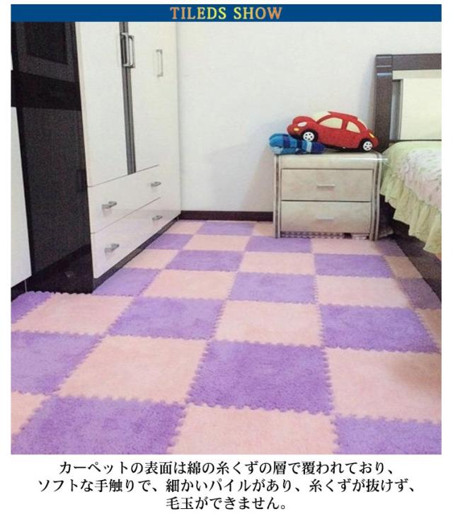 | 厚手の絨毯型ジョイントマットです。毛足は約10mmで、可愛くて手足を優しく包み込んでくれるようなボリューム感です。 カーペットの表面は綿の糸くずの層で覆われており、ソフトな手触りで、細かいパイルがあり、糸くずが抜けず、毛玉ができません。 自由に玄関、廊下、階段、リビングなどの場所に組み合わすことができます。 カッターやはさみで簡単に切れるのでレイアウト自由自在! 夏用の冷房対策、冬は耐熱加工を施してあるのでホットカーペットや床暖房にも対応します。夏はさらっと冬はあたたかく一年中快適です。 EVA素材は塩素や環境ホルモンを含まないため、焼却してもダイオキシンが発生しない安全素材です。玩具にも使用される素材なので、お子様にも安心してご使用いただけます。毛足が長くてふかふかですが、コロコロでも毛が抜けないので掃除しやすくてとてもいいです。 | |