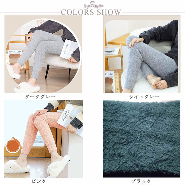 | 寒い秋冬に暖かいのルームパンツとして、眠る時のパジャマとしてもおすすめ。もちろんスカートの下に履いてもOK!クセになるあたたかさです? ♪やさしい肌触りの10分丈レギンス。ほどよくフィットして暖かく、一日中履いていたい気持ち良さです! ハイウエスト仕様で股上が長いので腹巻のようにおなかをカバーして冷えから守ります。とっても良く伸びるのでマタニティタイツとしてもご使用いただけます。足首は緩すぎず締め付けすぎない、ほど良い感じで絞られているので裾が上がりにくくなっています。 洗濯した時の洗い替え用にも色違いで持っていると楽しい♪ふわふわモコモコであったかいルームパンツです。オシャレで楽ちんな部屋着にもピッタリ。 | |