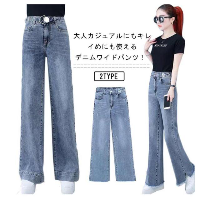 バックゴム デニムワイドパンツ ロング丈 デニムパンツ ワイド デニム ガウチョパンツ ジーンズ ハイウエスト 裾フリンジ カットオフ ボトムス パンツ ワイドパンツ キレイめ カジュアル 脚長 大きサイズ 送料無料