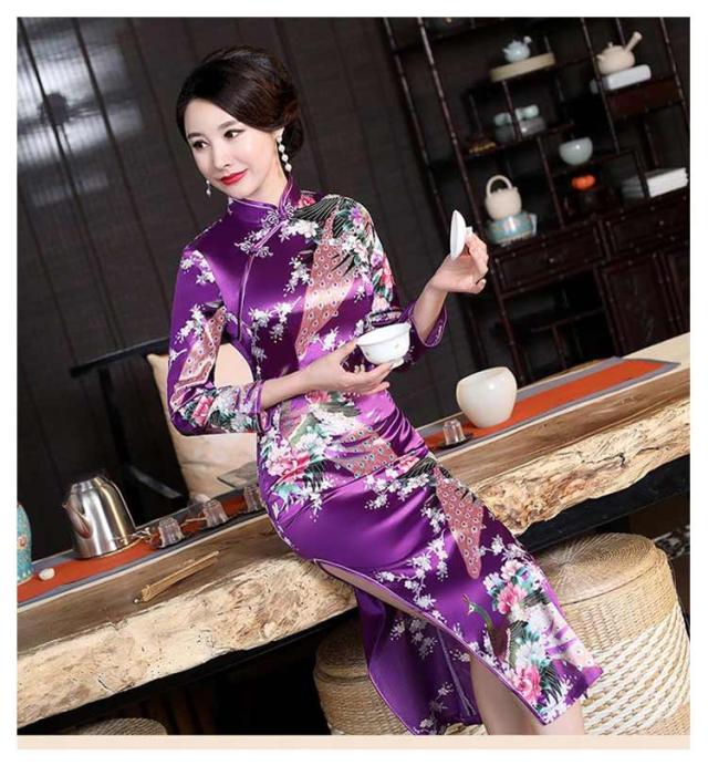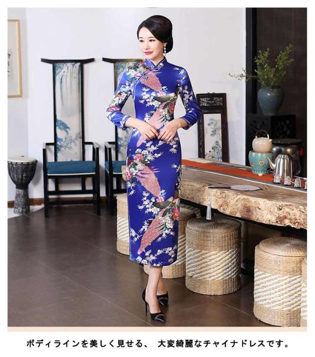 | ボディラインを美しく見せる、 大変綺麗なチャイナドレスです。 ロング丈にスリットで脚長効果抜群です。 孔雀&花柄の美しいデザインです。 | |
