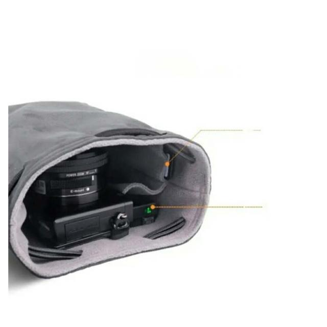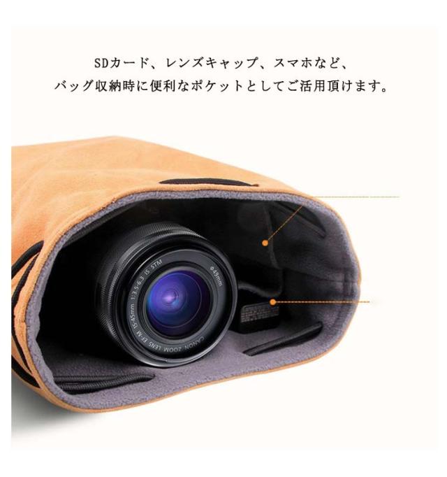 | お手持ちのバッグにこのインナーケースを入れれば安心してカメラを持ち運べます! ミラーレス一眼レフカメラとレンズの収納に最適のサイズ。 巾着型なので、サッと広げてOK。紐を引っ張れば閉める!そのまま収納でき、すぐに使えて便利です。 柔らかい生地を採用されて、大切なカメラやレンジが擦り傷をつけることを心配する ことがありません、汚れ、ホコリなどから守ります。 SDカード、レンズキャップ、スマホなど、バッグ収納時に便利なポケットとしてご活用頂けます。 | |