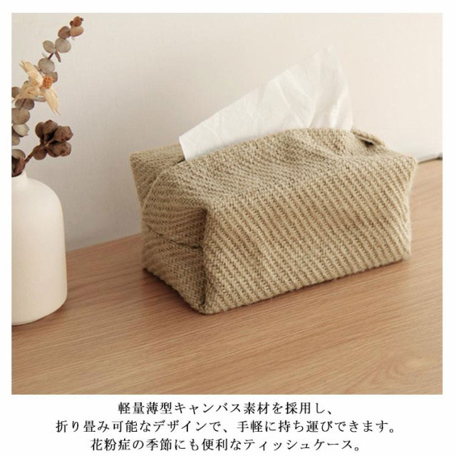 | 綿麻素材を使用したティッシュカバーで、あたたかみのあるナチュラルなデザインがおしゃれ。 軽量薄型キャンバス素材を採用し、折り畳み可能なデザインで、手軽に持ち運びできます。花粉症の季節にも便利なティッシュケース。 取り出し口も広くティッシュもさっと取り出せます。 シンプルなデザインでリビング、洗面所、バスルーム、トイレ、キッチンなど使う場所を選びません。 | |