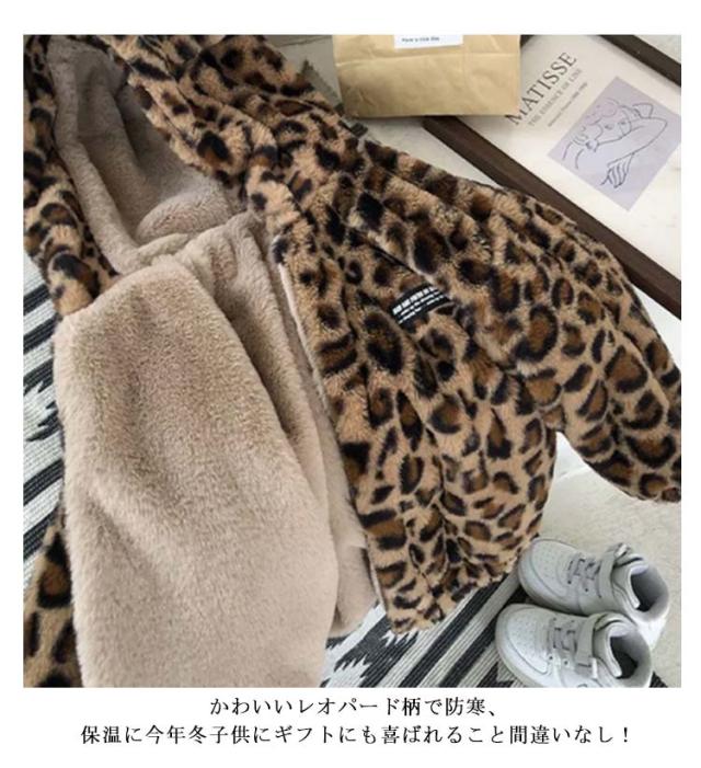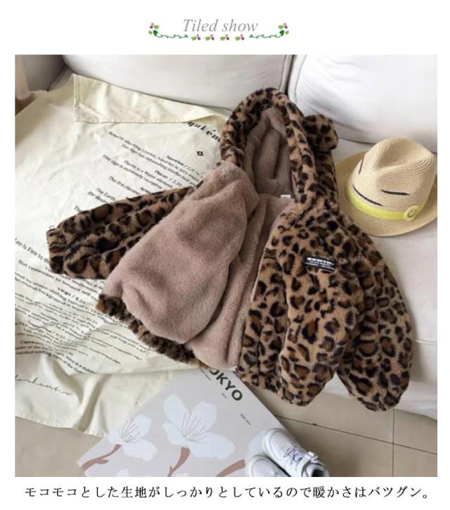 | 超かわいい耳付きデザイン!厳しい寒さでも安心できるファーコート。 モコモコとした生地がしっかりとしているので暖かさはバツグン。 シルエットが綺麗で着るだけでかっこよく決まります。 フード付いて冷風を防ぎ、子どもの頭を守て防寒性を発揮します。 かわいいレオパード柄で防寒、保温に今年冬子供にギフトにも喜ばれること間違いなし! | |