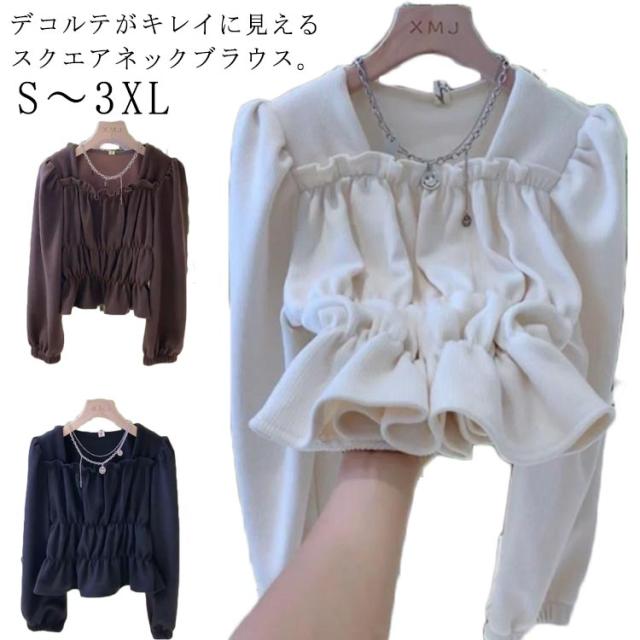 レディース 韓国ファッション ブラウス スクエアネック 長袖 ロングシャツ トップス ガーリー 甘口コーデ キュート 可愛い フェミニン 上品 デート 学生 おしゃれ お出かけ デイリー 普段着 スクエアネック ブラック 大きいサイズ